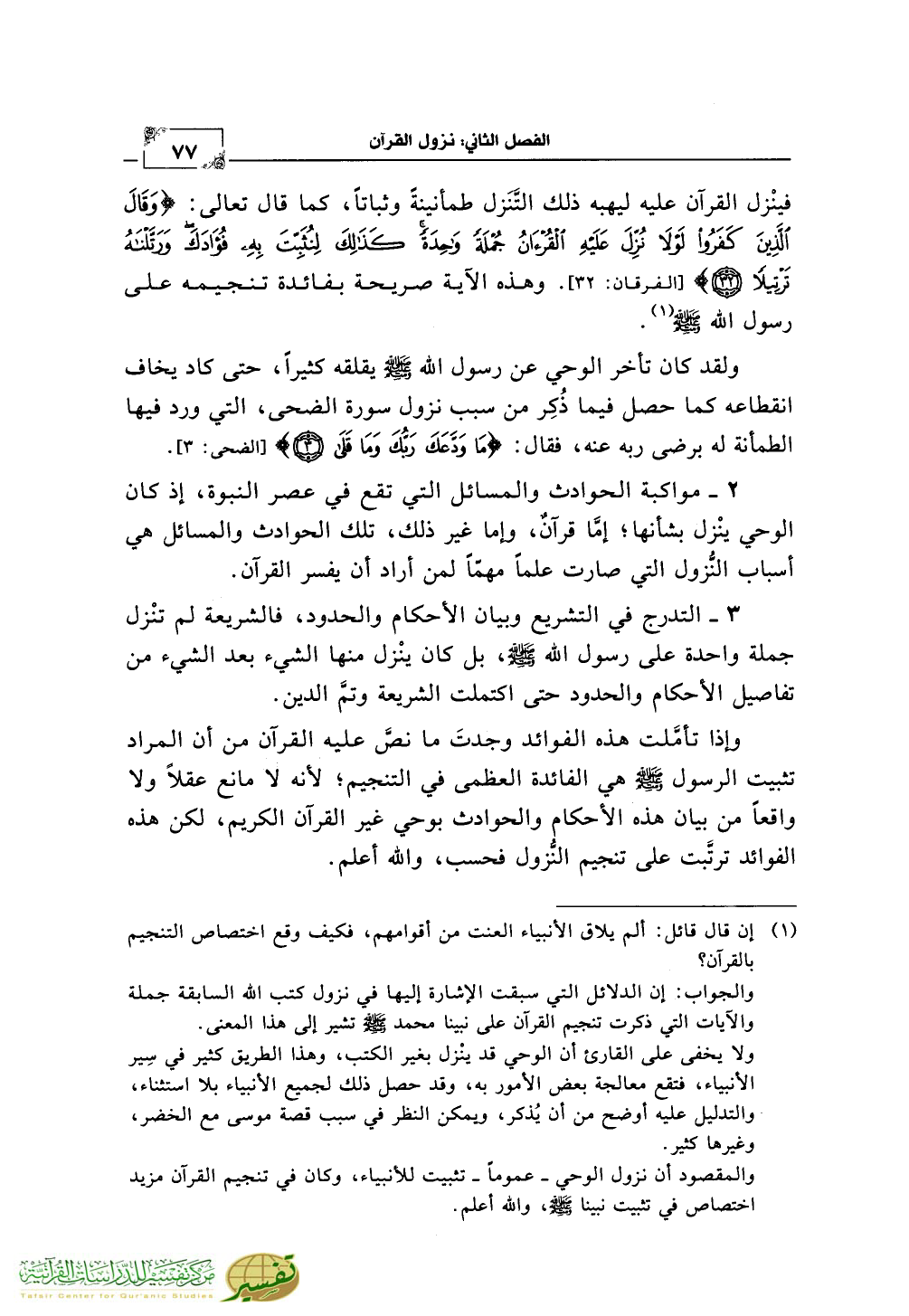 فينْزل القرآن عليه ليهبه ذلك التَّنَزل طمأنينةً وثباتاً، كما قال تعالى: {وَقَالَ الَّذِينَ كَفَرُوا لَوْلاَ نُزِّلَ عَلَيْهِ الْقُرْآنُ جُمْلَةً وَاحِدَةً كَذَلِكَ لِنُثَبِّتَ بِهِ فُؤَادَكَ وَرَتَّلْنَاهُ تَرْتِيلاً} [الفرقان: 32]. وهذه الآية صريحة بفائدة تنجيمه على رسول الله صلّى الله عليه وسلّم (¬1).