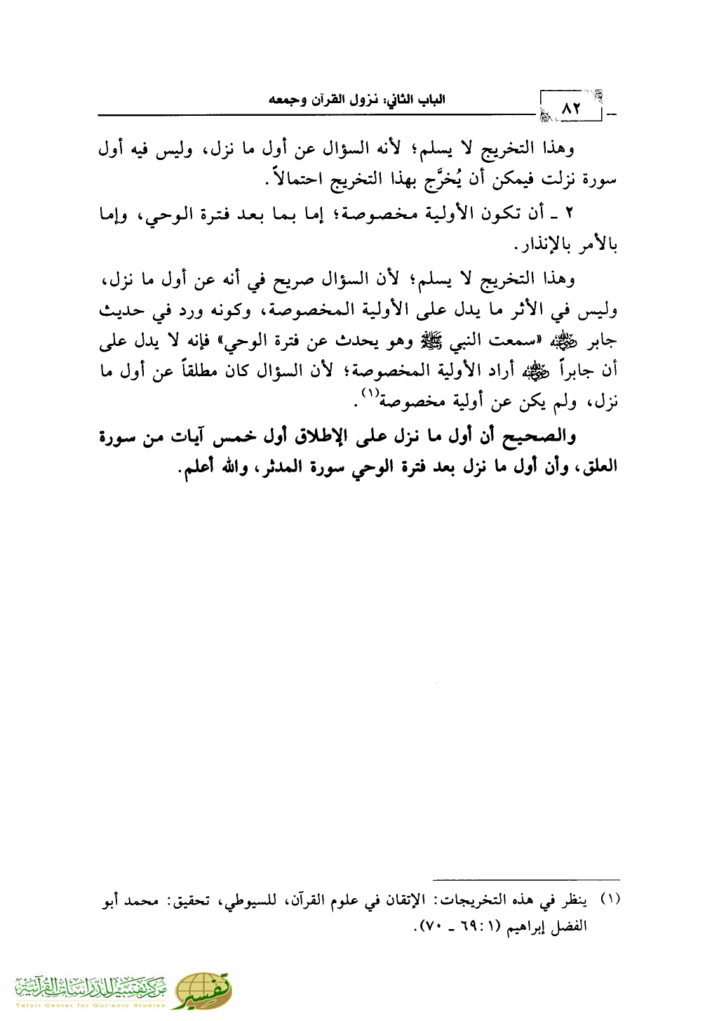 وهذا التخريج لا يسلم؛ لأن السؤال صريح في أنه عن أول ما نزل، وليس في الأثر ما يدل على الأولية المخصوصة، وكونه ورد في حديث جابر رضي الله عنه «سمعت النبي صلّى الله عليه وسلّم وهو يحدث عن فترة الوحي» فإنه لا يدل على أن جابراً رضي الله عنه أراد الأولية المخصوصة؛ لأن السؤال كان مطلقاً عن أول ما نزل، ولم يكن عن أولية مخصوصة (¬1).