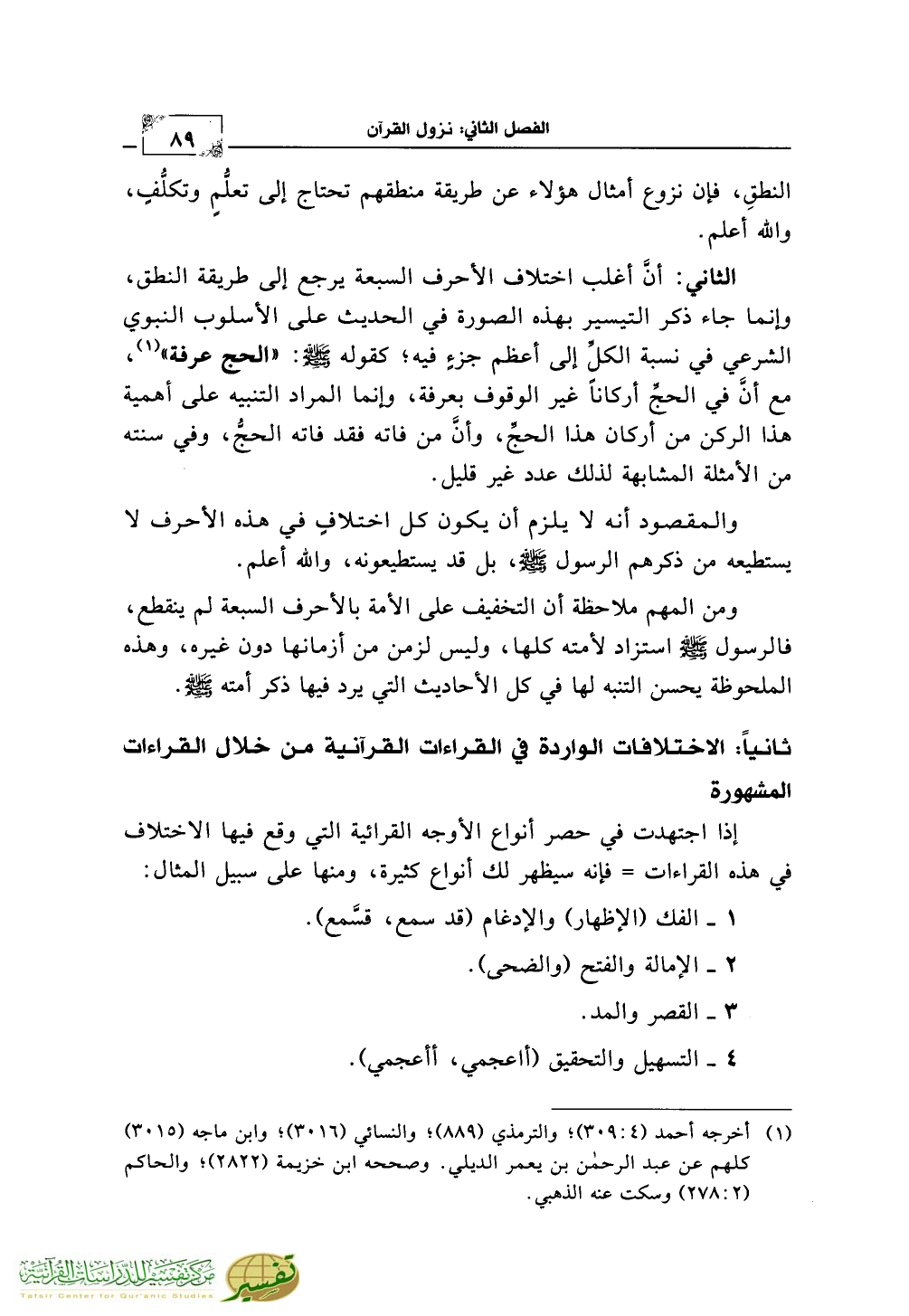 الثاني: أنَّ أغلب اختلاف الأحرف السبعة يرجع إلى طريقة النطق، وإنما جاء ذكر التيسير بهذه الصورة في الحديث على الأسلوب النبوي الشرعي في نسبة الكلِّ إلى أعظم جزءٍ فيه؛ كقوله صلّى الله عليه وسلّم: «الحج عرفة» (¬1)، مع أنَّ في الحجِّ أركاناً غير الوقوف بعرفة، وإنما المراد التنبيه على أهمية هذا الركن من أركان هذا الحجِّ، وأنَّ من فاته فقد فاته الحجُّ، وفي سنته من الأمثلة المشابهة لذلك عدد غير قليل.