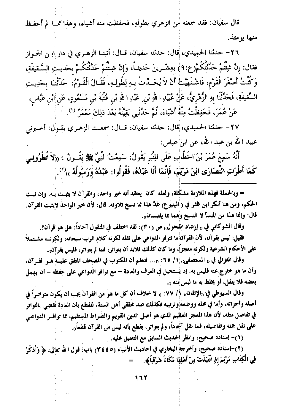 27 - حَدَّثَنَا الْحُمَيْدِيُّ، ثنا سُفْيَانُ قَالَ: سَمِعْتُ الزُّهْرِيَّ يَقُولُ: أَخْبَرَنِي عُبَيْدُ اللَّهِ بْنُ عَبْدِ اللَّهِ، عَنِ ابْنِ عَبَّاسٍ أَنَّهُ سَمِعَ عُمَرَ بْنَ الْخَطَّابِ عَلَى الْمِنْبَرِ يَقُولُ: سَمِعْتُ النَّبِيَّ صَلَّى اللهُ عَلَيْهِ وَسَلَّمَ يَقُولُ: «§لَا تُطْرُونِي كَمَا أَطْرَتِ النَّصَارَى ابْنَ مَرْيَمَ فَإِنَّمَا أَنَا عَبْدُهُ فَقُولُوا عَبْدُهُ وَرَسُولُهُ»