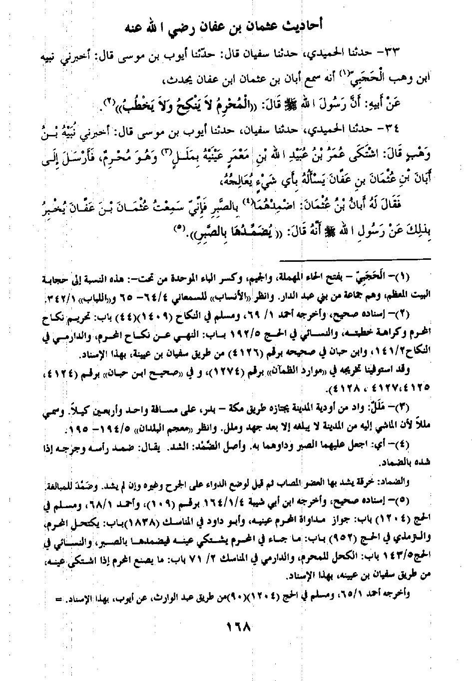 33 - حَدَّثَنَا الْحُمَيْدِيُّ، ثنا سُفْيَانُ، ثنا أَيُّوبُ بْنُ مُوسَى، أَخْبَرَنِي نُبَيْهُ بْنُ وَهْبٍ الْحَجِّيُّ أَنَّهُ سَمِعَ أَبَانَ بْنَ عُثْمَانَ بْنِ عَفَّانَ يُحَدِّثُ عَنْ أَبِيهِ، أَنَّ رَسُولَ اللَّهِ صَلَّى اللهُ عَلَيْهِ وَسَلَّمَ قَالَ: «§الْمُحْرِمُ لَا يَنْكِحُ وَلَا يَخْطُبُ»