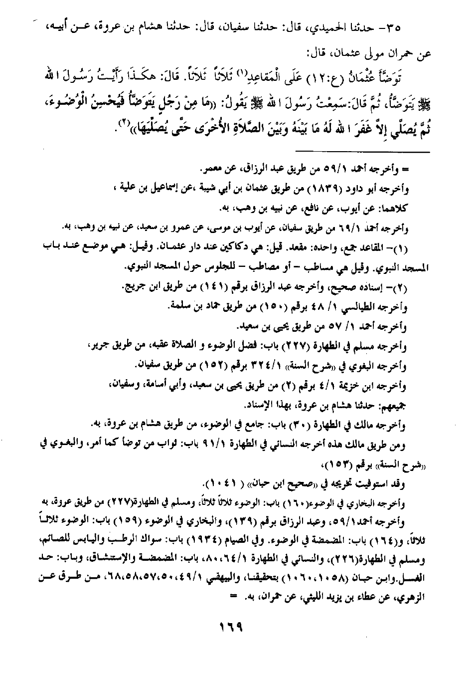 35 - حَدَّثَنَا الْحُمَيْدِيُّ، ثنا سُفْيَانُ، ثنا هِشَامُ بْنُ عُرْوَةَ، عَنْ أَبِيهِ، عَنْ حُمْرَانَ مَوْلَى عُثْمَانَ قَالَ: تَوَضَّأَ عُثْمَانُ عَلَى الْمَقَاعِدِ ثَلَاثًا ثَلَاثًا، قَالَ: هَكَذَا رَأَيْتُ رَسُولَ اللَّهِ صَلَّى اللهُ عَلَيْهِ وَسَلَّمَ يَتَوَضَّأُ، ثُمَّ قَالَ: سَمِعْتُ رَسُولَ اللَّهِ صَلَّى اللهُ عَلَيْهِ وَسَلَّمَ يَقُولُ: «§مَا مِنْ رَجُلٍ يَتَوَضَّأُ فَيُحْسِنُ الْوُضُوءَ ثُمَّ يُصَلِّي إِلَّا غَفَرَ اللَّهُ لَهُ مَا بَيْنَهُ وَبَيْنَ الصَّلَاةِ الْأُخْرَى حَتَّى يُصَلِّيَهَا»