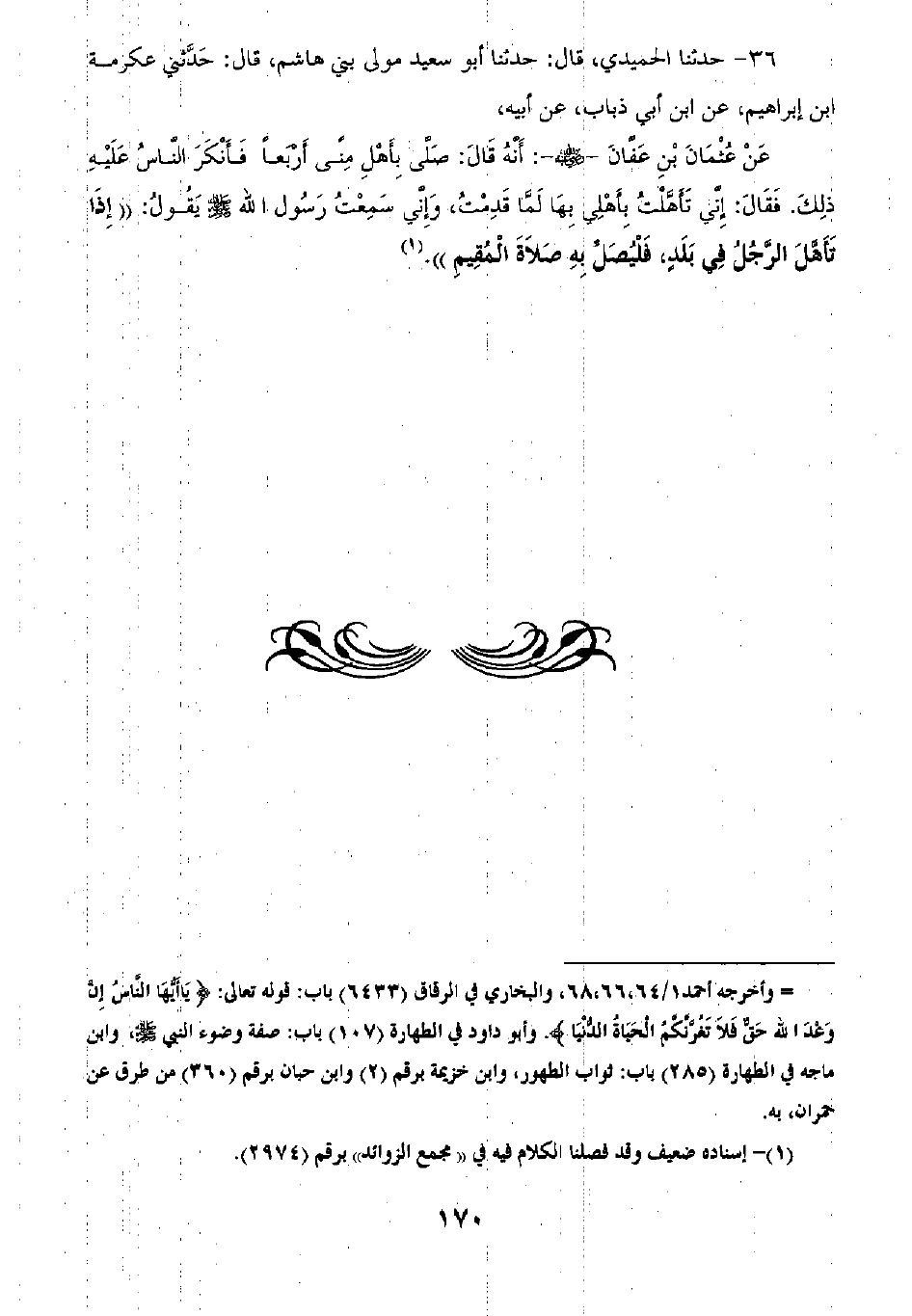 36 - حَدَّثَنَا الْحُمَيْدِيُّ، ثنا أَبُو سَعِيدٍ مَوْلَى بَنِي هَاشِمٍ، ثني عِكْرِمَةُ بْنُ إِبْرَاهِيمَ، عَنِ ابْنِ أَبِي ذُبَابٍ، عَنْ أَبِيهِ، عَنْ عُثْمَانَ بْنِ عَفَّانَ رَضِيَ اللَّهُ عَنْهُ أَنَّهُ قَالَ: صَلَّى بِأَهْلِ مِنًى أَرْبَعًا فَأَنْكَرَ النَّاسُ عَلَيْهِ ذَلِكَ فَقَالَ: إِنِّي تَأَهَّلْتُ بِأَهْلِي بِهَا لَمَّا قَدِمْتُ، وَإِنِّي سَمِعْتُ رَسُولَ اللَّهِ صَلَّى اللهُ عَلَيْهِ وَسَلَّمَ يَقُولُ: «§إِذَا تَأَهَّلَ الرَّجُلُ فِي بَلَدٍ فَلْيُصَلِّ بِهِ صَلَاةَ الْمُقِيمِ»