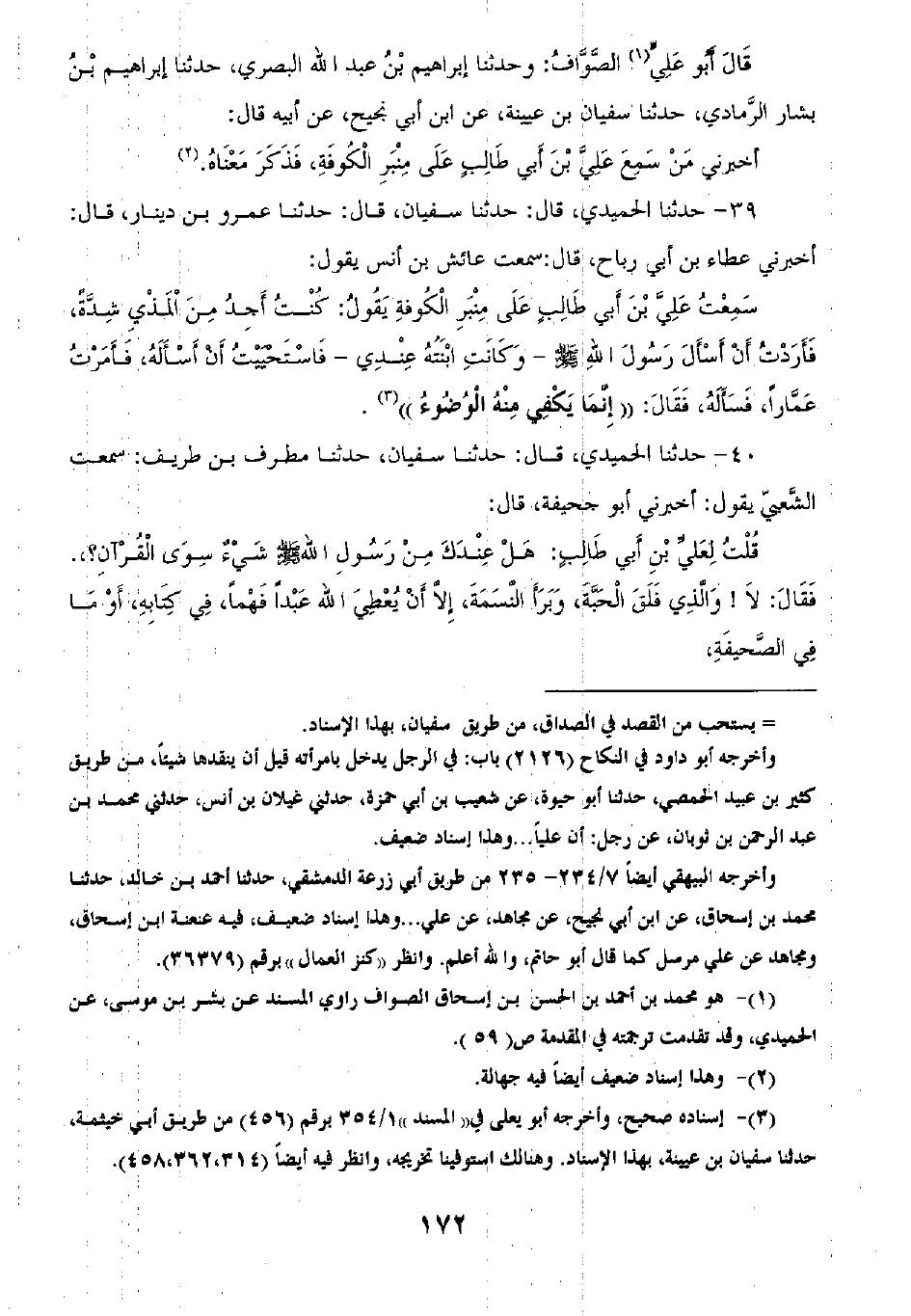 40 - حَدَّثَنَا الْحُمَيْدِيُّ، ثنا سُفْيَانُ، ثنا مُطَرِّفُ بْنُ طَرِيفٍ سَمِعْتُ الشَّعْبِيَّ يَقُولُ: أَخْبَرَنِي أَبُو جُحَيْفَةَ قَالَ: قُلْتُ لِعَلِيِّ بْنِ أَبِي طَالِبٍ: " هَلْ عِنْدَكَ مِنْ رَسُولِ اللَّهِ صَلَّى اللهُ عَلَيْهِ وَسَلَّمَ شَيْءٌ سِوَى الْقُرْآنِ؟ فَقَالَ: لَا وَالَّذِي فَلَقَ الْحَبَّةَ وَبَرَأَ النَّسَمَةَ §إِلَّا أَنْ يُعْطِيَ اللَّهُ عَبْدًا فَهْمًا فِي كِتَابِهِ، أَوْ مَا فِي الصَّحِيفَةِ -[173]- قُلْتُ: وَمَا فِي الصَّحِيفَةِ؟ قَالَ: الْعَقْلُ، وَفِكَاكُ الْأَسِيرِ، وَأَنْ لَا يُقْتَلَ مُسْلِمٌ بِكَافِرٍ "