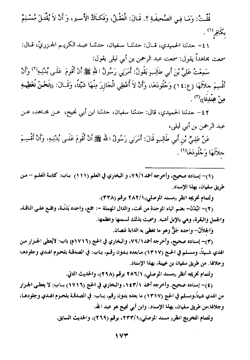 41 - حَدَّثَنَا الْحُمَيْدِيُّ، ثنا سُفْيَانُ، ثنا عَبْدُ الْكَرِيمِ الْجَزَرِيُّ سَمِعْتُ مُجَاهِدًا، سَمِعْتُ عَبْدَ الرَّحْمَنِ بْنَ أَبِي لَيْلَى يَقُولُ: سَمِعْتُ عَلِيَّ بْنَ أَبِي طَالِبٍ يَقُولُ: " أَمَرَنِي رَسُولُ اللَّهِ صَلَّى اللهُ عَلَيْهِ وَسَلَّمَ أَنْ §أَقُومَ عَلَى بُدْنِهِ، وَأَنْ أُقَسِّمَ جِلَالَهَا وَجُلُودَهَا، وَأَنْ لَا أُعْطِيَ الْجَازِرَ مِنْهَا شَيْئًا، وَقَالَ: نَحْنُ نُعْطِيهِ مِنْ عِنْدِنَا "