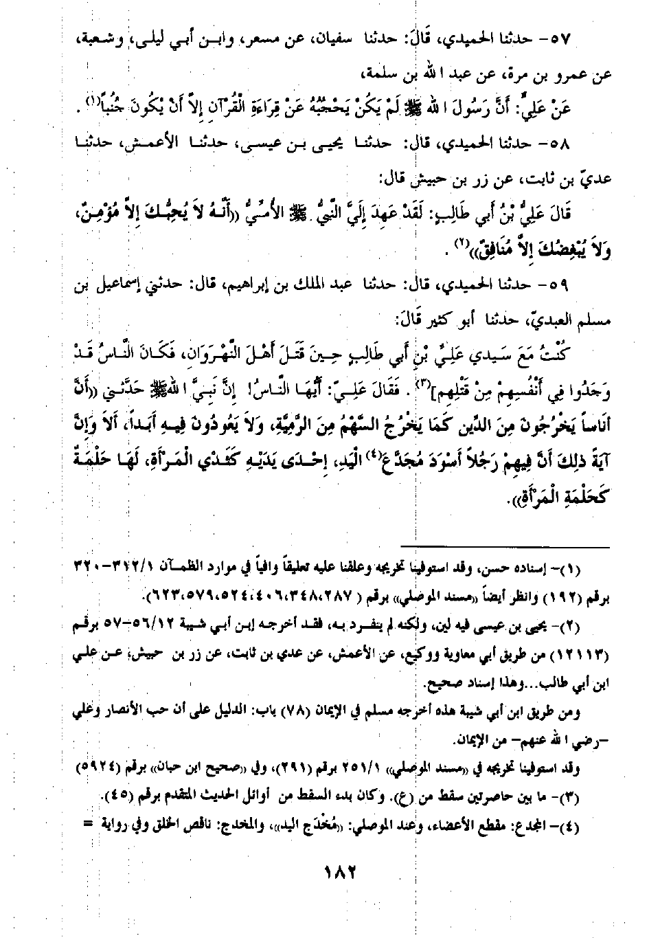 58 - حَدَّثَنَا الْحُمَيْدِيُّ، ثنا يَحْيَى بْنُ عِيسَى، ثنا الْأَعْمَشُ، ثنا عَدِيُّ بْنُ ثَابِتٍ، عَنْ زِرِّ بْنِ حُبَيْشٍ قَالَ: قَالَ عَلِيُّ بْنُ أَبِي طَالِبٍ «لَقَدْ عَهِدَ إِلَيَّ النَّبِيُّ صَلَّى اللهُ عَلَيْهِ وَسَلَّمَ الْأُمِّيُّ أَنَّهُ §لَا يُحِبُّكَ إِلَّا مُؤْمِنٌ، وَلَا يُبْغِضُكَ إِلَّا مُنَافِقٌ»