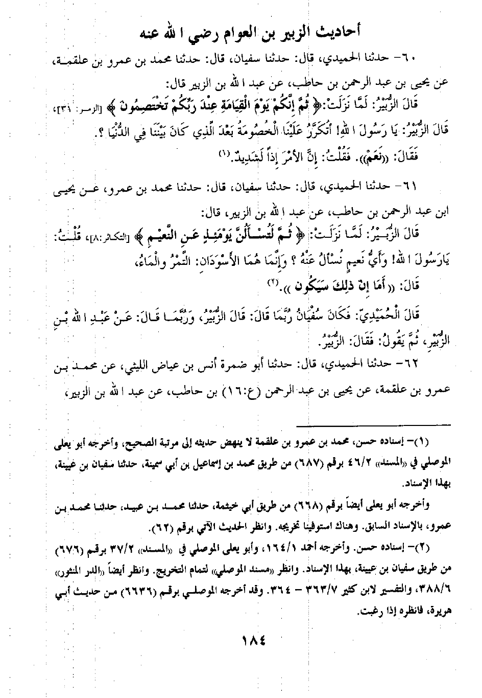 60 - حَدَّثَنَا الْحُمَيْدِيُّ، ثنا سُفْيَانُ، ثنا مُحَمَّدُ بْنُ عَمْرِو بْنِ عَلْقَمَةَ، عَنْ يَحْيَى بْنِ عَبْدِ الرَّحْمَنِ بْنِ حَاطِبٍ، عَنْ عَبْدِ اللَّهِ بْنِ الزُّبَيْرِ قَالَ: قَالَ الزُّبَيْرُ: لَمَّا نَزَلَتْ {§ثُمَّ إِنَّكُمْ يَوْمَ الْقِيَامَةِ عِنْدَ رَبِّكُمْ تَخْتَصِمُونَ} [الزمر: 31] قَالَ الزُّبَيْرُ يَا رَسُولَ اللَّهِ أَتُكَرَّرُ عَلَيْنَا الْخُصُومَةُ بَعْدَ الَّذِي كَانَ بَيْنَنَا فِي الدُّنْيَا فَقَالَ «نَعَمْ» فَقُلْتُ: إِنَّ الْأَمْرَ إِذًا لَشَدِيدٌ