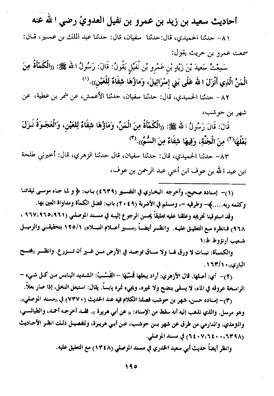 81 - حَدَّثَنَا الْحُمَيْدِيُّ، ثنا سُفْيَانُ، ثنا عَبْدُ الْمَلِكِ بْنُ عُمَيْرٍ سَمِعْتُ عَمْرَو بْنَ حُرَيْثٍ يَقُولُ سَمِعْتُ سَعِيدَ بْنَ زَيْدِ بْنِ عَمْرِو بْنِ نُفَيْلٍ يَقُولُ: قَالَ رَسُولُ اللَّهِ صَلَّى اللهُ عَلَيْهِ وَسَلَّمَ: «§الْكَمْأَةُ مِنَ الْمَنِّ الَّذِي أَنْزَلَ اللَّهُ عَلَى بَنِي إِسْرَائِيلَ وَمَاؤُهَا شِفَاءٌ لِلْعَيْنِ»