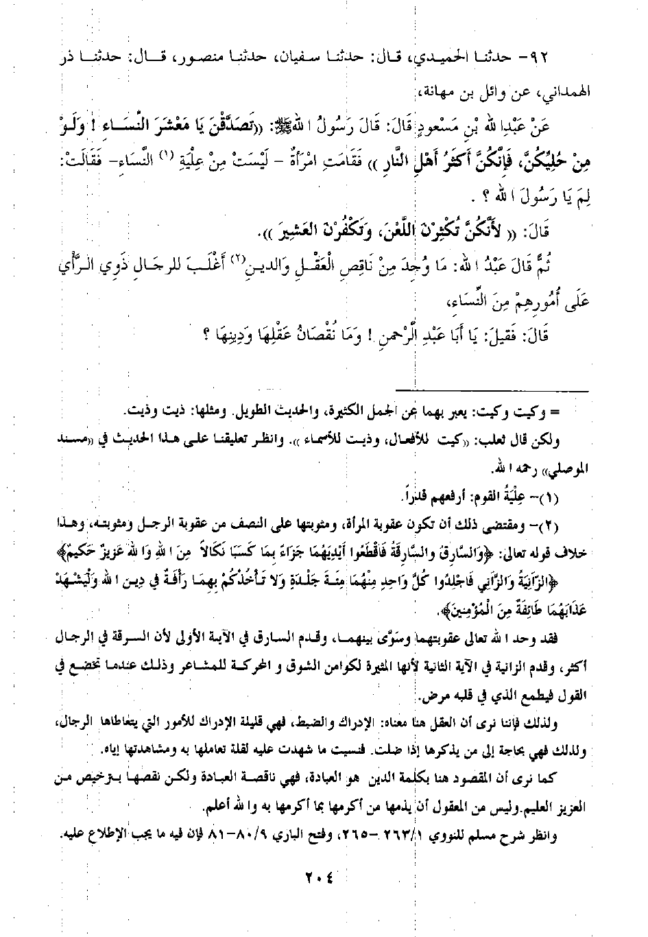 92 - ثُمَّ قَالَ عَبْدُ اللَّهِ: «§مَا وُجِدَ مِنْ نَاقِصِ الْعَقْلِ وَالدِّينِ أَغْلَبَ لِلرِّجَالِ ذَوِي الرَّأْيِ عَلَى أُمُورِهِمْ مِنَ النِّسَاءِ» قَالَ: فَقِيلَ: يَا أَبَا عَبْدِ الرَّحْمَنِ وَمَا نُقْصَانُ عَقْلِهَا وَدِينِهَا؟ -[205]- قَالَ: «أَمَّا نُقْصَانُ عَقْلِهَا فَجَعَلَ اللَّهُ شَهَادَةَ امْرَأَتَيْنِ بِشَهَادَةِ رَجُلٍ، وَأَمَّا نُقْصَانُ دِينِهَا فَإِنَّهَا تَمْكُثُ كَذَا يَوْمًا لَا تُصَلِّي لِلَّهِ سَجْدَةً»