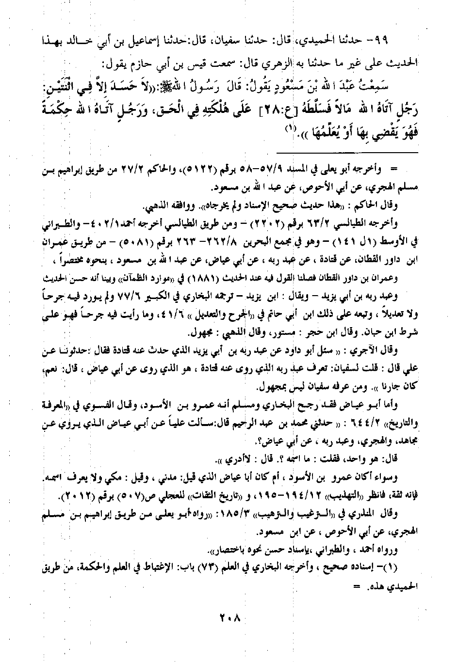 99 - حَدَّثَنَا الْحُمَيْدِيُّ، ثنا سُفْيَانُ، ثنا إِسْمَاعِيلُ بْنُ أَبِي خَالِدٍ بِهَذَا الْحَدِيثِ عَلَى غَيْرِ مَا حَدَّثَنَا بِهِ الزُّهْرِيُّ قَالَ سَمِعْتُ قَيْسَ بْنَ أَبِي حَازِمٍ يَقُولُ: سَمِعْتُ عَبْدَ اللَّهِ بْنَ مَسْعُودِ يَقُولُ: قَالَ رَسُولُ اللَّهِ صَلَّى اللهُ عَلَيْهِ وَسَلَّمَ: " §لَا حَسَدَ إِلَّا فِي اثْنَتَيْنِ: رَجُلٍ آتَاهُ اللَّهُ مَالًا فَسَلَّطَهُ عَلَى هَلَكَتِهِ فِي الْحَقِّ، وَرَجُلٍ آتَاهُ اللَّهُ حِكْمَةً فَهُوَ يَقْضِي بِهَا أَوْ يُعَلِّمُهَا "
