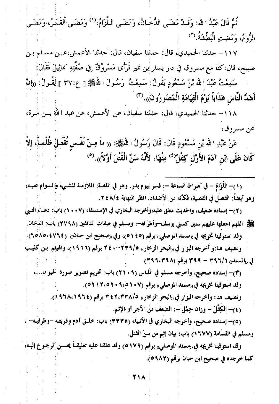 118 - حَدَّثَنَا الْحُمَيْدِيُّ، ثنا سُفْيَانُ، عَنِ الْأَعْمَشِ، عَنْ عَبْدِ اللَّهِ بْنِ مُرَّةَ، عَنْ مَسْرُوقٍ، عَنْ عَبْدِ اللَّهِ بْنِ مَسْعُودٍ قَالَ: قَالَ رَسُولُ اللَّهِ صَلَّى اللهُ عَلَيْهِ وَسَلَّمَ: «§مَا مِنْ نَفْسٍ تُقْتَلُ ظُلْمًا إِلَّا كَانَ عَلَى ابْنِ آدَمَ الْأَوَّلِ كِفْلٌ مِنْهَا لِأَنَّهُ سَنَّ الْقَتْلَ أَوَّلًّا»