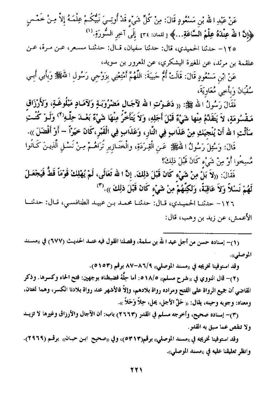 125 - حَدَّثَنَا الْحُمَيْدِيُّ، ثنا سُفْيَانُ قَالَ: ثنا مِسْعَرٌ، عَنْ مُرَّةَ، عَنْ عَلْقَمَةَ بْنِ مَرْثَدٍ، عَنِ الْمُغِيرَةِ الْيَشْكُرِيِّ، عَنِ الْمَعْرُورِ بْنِ سُوَيْدٍ، عَنِ ابْنِ مَسْعُودٍ قَالَ: قَالَتْ أُمُّ حَبِيبَةَ: اللَّهُمَّ أَمْتِعْنِي بِزَوْجِي رَسُولِ اللَّهِ صَلَّى اللهُ عَلَيْهِ وَسَلَّمَ، وَبِأَبِي أَبِي سُفْيَانَ وَبِأَخِي مُعَاوِيَةَ، فَقَالَ رَسُولُ اللَّهِ صَلَّى اللهُ عَلَيْهِ وَسَلَّمَ: «§دَعَوْتِ اللَّهَ لِآجَالٍ مَضْرُوبَةٍ، وَلِآمَادٍ مَبْلُوغَةٍ، وَلِأَرْزَاقٍ مَقْسُومَةٍ لَا يَتَقَدَّمُ مِنْهَا شَيْءُ قَبْلَ أَجَلِهِ، وَلَا يَتَأَخَّرُ مِنْهَا شَيْءٌ بَعْدَ حِلِّهِ، وَلَوْ كُنْتِ سَأَلْتِ اللَّهِ أَنْ يُنْجِيَكِ مِنْ عَذَابٍ فِي النَّارِ، وَعَذَابٍ فِي الْقَبْرِ كَانَ خَيْرًا أَوْ أَفْضَلَ»