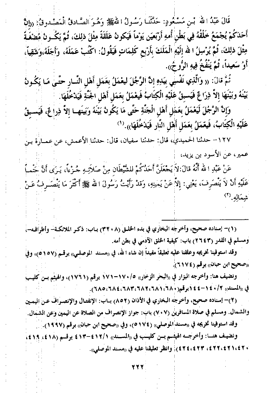 127 - حَدَّثَنَا الْحُمَيْدِيُّ، ثنا سُفْيَانُ قَالَ: ثنا الْأَعْمَشُ، عَنْ عُمَارَةَ بْنِ عُمَيْرٍ، عَنِ الْأَسْوَدِ بْنِ يَزِيدَ، عَنْ عَبْدِ اللَّهِ أَنَّهُ قَالَ: §لَا يَجْعَلَنَّ أَحَدُكُمْ لِلشَّيْطَانِ مِنْ صَلَاتِهِ جُزْءًا يَرَى أَنَّ حَتْمًا عَلَيْهِ أَنْ لَا يَنْصَرِفَ يَعْنِي إِلَّا عَنْ يَمِينِهِ وَقَدْ «رَأَيْتُ رَسُولَ اللَّهِ صَلَّى اللهُ عَلَيْهِ وَسَلَّمَ أَكْثَرُ مَا يَنْصَرِفُ عَنْ شِمَالِهِ»