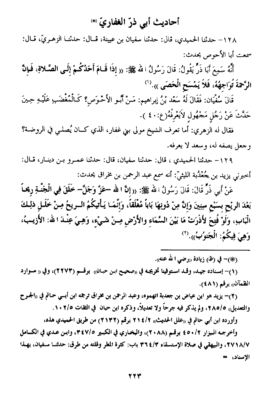 128 - حَدَّثَنَا الْحُمَيْدِيُّ، ثنا سُفْيَانُ بْنُ عُيَيْنَةَ قَالَ: ثنا الزُّهْرِيُّ قَالَ: سَمِعْتُ أَبَا الْأَحْوَصِ يُحَدِّثُ أَنَّهُ سَمِعَ أَبَا ذَرٍّ يَقُولُ: قَالَ رَسُولُ اللَّهِ صَلَّى اللهُ عَلَيْهِ وَسَلَّمَ: «§إِذَا قَامَ أَحَدُكُمْ إِلَى الصَّلَاةِ فَإِنَّ الرَّحْمَةَ تُواجِهُهُ فَلَا يَمْسَحِ الْحَصَى» قَالَ سُفْيَانُ: فَقَالَ لَهُ سَعْدُ بْنُ إِبْرَاهِيمَ: مَنْ أَبُو الْأَحْوَصِ؟ كَالْمُغْضَبِ عَلَيْهِ حِينَ حَدَّثَ عَنْ رَجُلٍ مَجْهُولٍ لَا يَعْرِفُهُ فَقَالَ لَهُ الزُّهْرِيُّ: أَمَا تَعْرِفُ الشَّيْخَ مَوْلَى بَنِي غِفَارٍ الَّذِي كَانَ يُصَلِّي فِي الرَّوْضَةِ؟ وَجَعَلَ يَصِفُهُ لَهُ وَسَعْدٌ لَا يَعْرِفُهُ