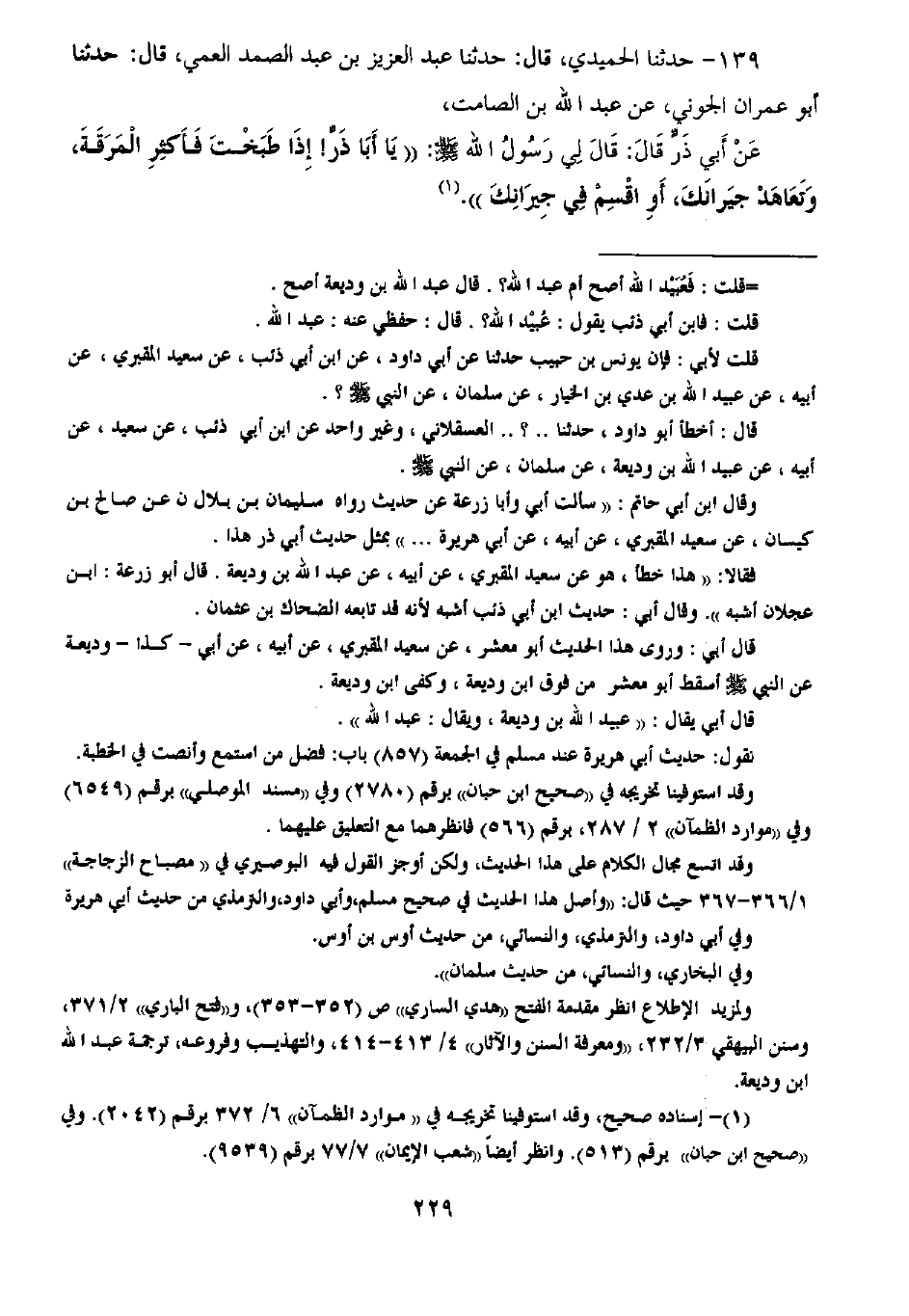 139 - حَدَّثَنَا الْحُمَيْدِيُّ، عَبْدُ الْعَزِيزِ بْنُ عَبْدِ الصَّمَدِ الْعَمِّيُّ قَالَ: ثنا أَبُو عِمْرَانَ الْجَوْنِيُّ، عَنْ عَبْدِ اللَّهِ بْنِ الصَّامِتِ، عَنْ أَبِي ذَرٍّ قَالَ: قَالَ لِي رَسُولُ اللَّهِ صَلَّى اللهُ عَلَيْهِ وَسَلَّمَ: «يَا أَبَا ذَرٍّ §إِذَا طَبَخْتَ فَأَكْثِرِ الْمَرَقَةَ، وَتَعَاهَدْ جِيرَانَكَ أَوِ اقْسِمْ فِي جِيرَانِكَ»