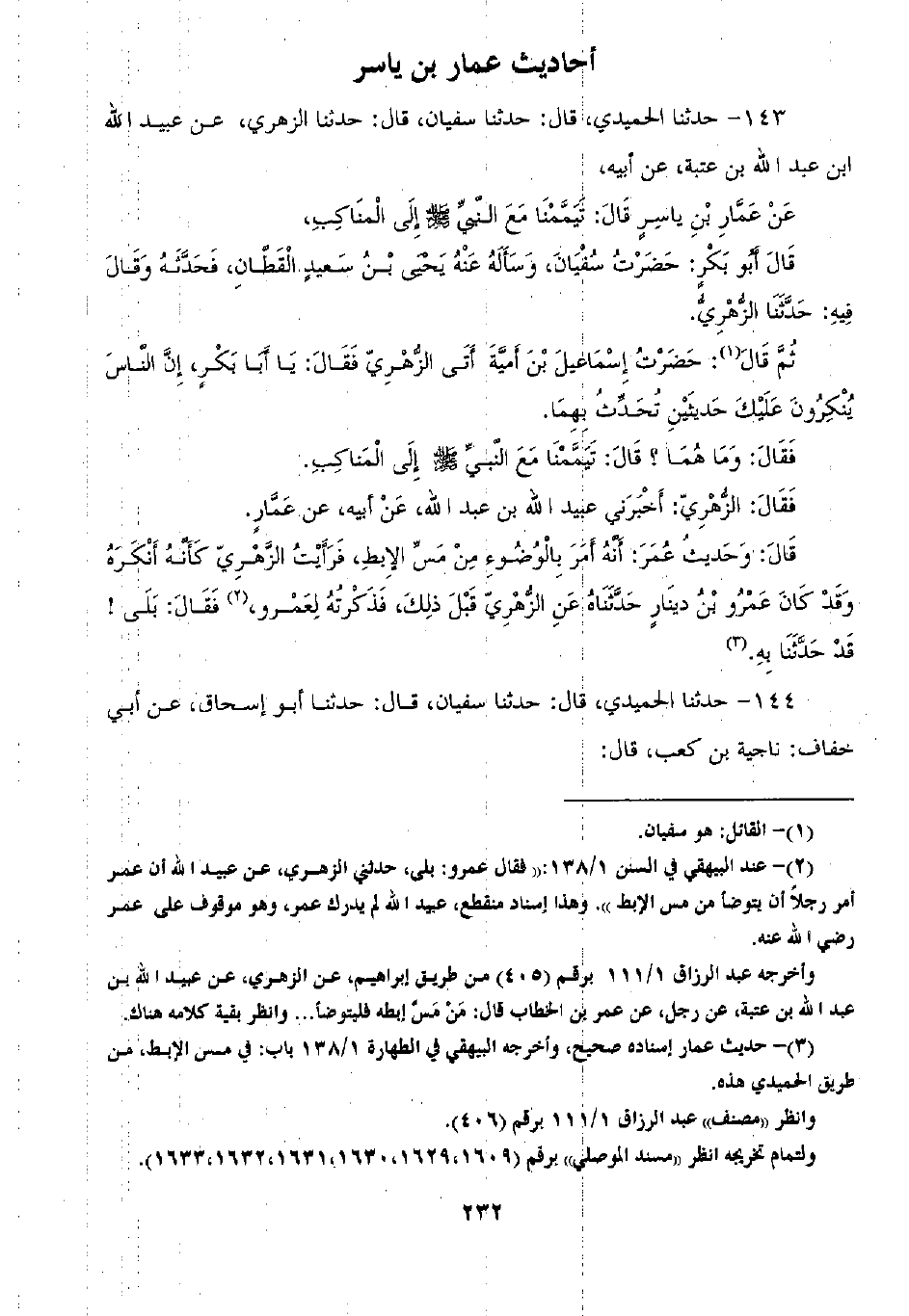 144 - حَدَّثَنَا الْحُمَيْدِيُّ قَالَ: ثنا سُفْيَانُ قَالَ: ثنا أَبُو إِسْحَاقَ، عَنْ أَبِي خِفَافٍ نَاجِيَةَ بْنِ كَعْبٍ قَالَ -[233]-: قَالَ عَمَّارٌ لِعُمَرَ: أَمَا تَذْكُرُ إِذْ كُنْتُ أَنَا وَأَنْتَ فِي الْإِبِلِ فَأَصَابَتْنِي جَنَابَةٌ فَتَمَعَّكْتُ كَمَا تَمَعَّكُ الدَّابَّةُ، ثُمَّ أَتَيْتُ النَّبِيَّ صَلَّى اللهُ عَلَيْهِ وَسَلَّمَ فَذَكَرْنَا ذَلِكَ لَهُ فَقَالَ «§إِنَّمَا كَانَ يَكْفِيكَ مِنْ ذَلِكَ التَّيَمُّمُ»