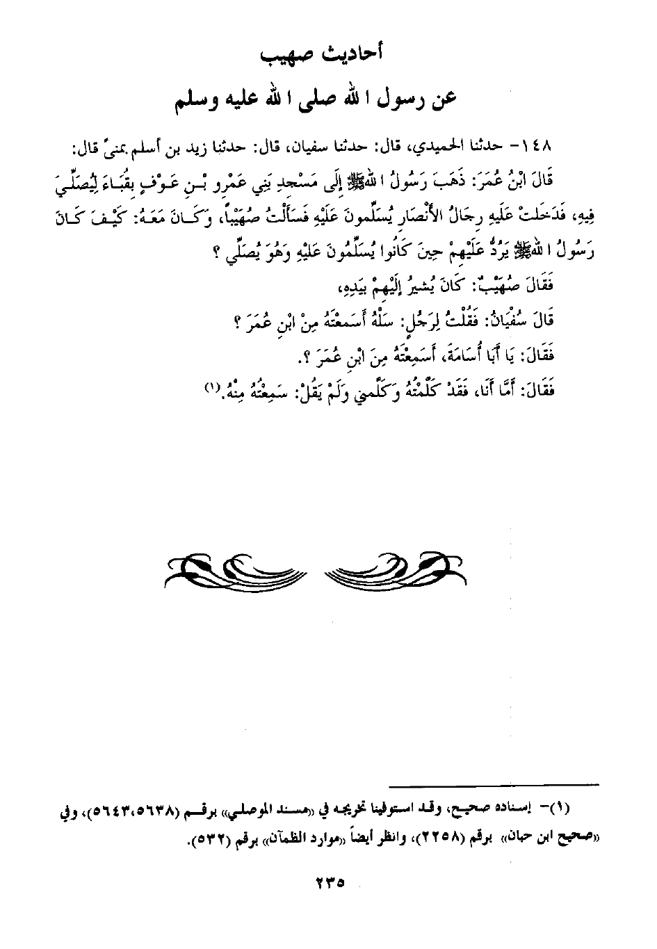 148 - حَدَّثَنَا الْحُمَيْدِيُّ، ثنا سُفْيَانُ قَالَ: ثنا زَيْدُ بْنُ أَسْلَمَ بِمِنًى قَالَ: قَالَ ابْنُ عُمَرَ: ذَهَبَ رَسُولُ اللَّهِ صَلَّى اللهُ عَلَيْهِ وَسَلَّمَ إِلَى مَسْجِدِ بَنِي عَمْرِو بْنِ عَوْفٍ بِقُبَا لِيُصَلِّيَ فِيهِ، فَدَخَلَتْ عَلَيْهِ رِجَالُ الْأَنْصَارِ يُسَلِّمُونَ عَلَيْهِ، فَسَأَلْتُ صُهَيْبًا وَكَانَ مَعَهُ §كَيْفَ كَانَ رَسُولُ اللَّهِ صَلَّى اللهُ عَلَيْهِ وَسَلَّمَ يَرُدُّ عَلَيْهِمْ حِينَ كَانُوا يُسَلِّمُونَ عَلَيْهِ وَهُوَ يُصَلِّي؟ فَقَالَ صُهَيْبٌ: «كَانَ يُشِيرُ إِلَيْهِمْ بِيَدِهِ» قَالَ سُفْيَانُ: فَقُلْتُ لِرَجُلٍ سَلْهُ أَسَمِعْتَهُ مِنِ ابْنِ عُمَرَ؟ فَقَالَ: يَا أَبَا أُسَامَةَ أَسَمِعْتَهُ مِنَ ابْنِ عُمَرَ؟ فَقَالَ: أَمَّا أَنَا فَقَدْ كَلَّمْتُهُ وَكَلَّمَنِي وَلَمْ يَقُلْ سَمِعْتُهُ مِنْهُ