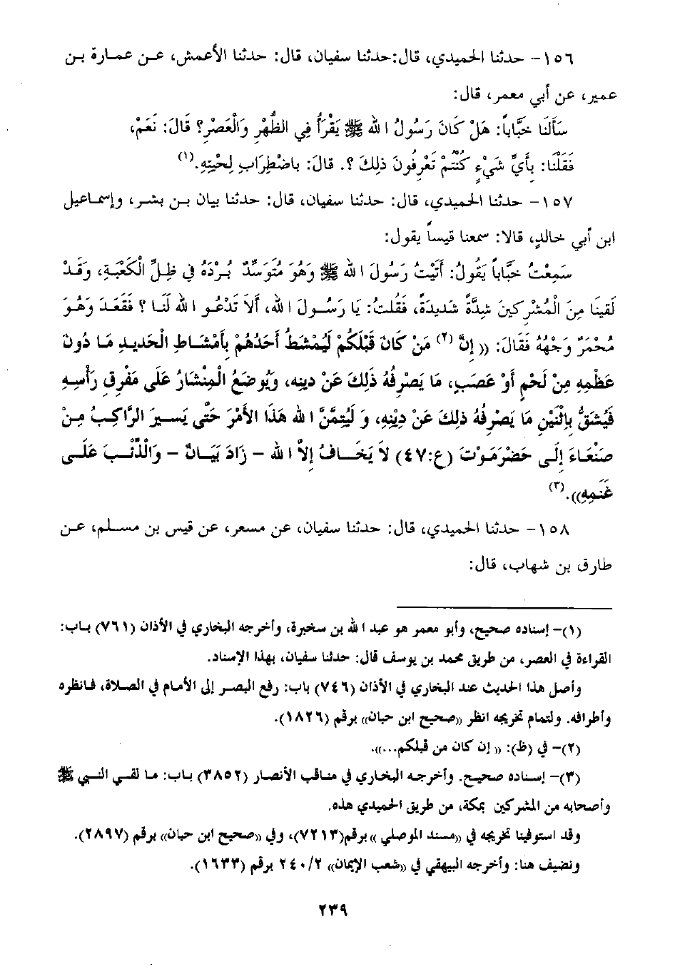 157 - حَدَّثَنَا الْحُمَيْدِيُّ قَالَ: ثنا سُفْيَانُ قَالَ: ثنا بَيَانُ بْنُ بِشْرٍ، وَإِسْمَاعِيلُ بْنُ أَبِي خَالِدٍ قَالَا: سَمِعْنَا قَيْسًا يَقُولُ: سَمِعْتُ خَبَّابًا يَقُولُ: أَتَيْتُ رَسُولَ اللَّهِ صَلَّى اللهُ عَلَيْهِ وَسَلَّمَ وَهُوَ مُتَوَسِّدٌ بُرْدَهُ فِي ظِلِّ الْكَعْبَةِ وَقَدْ لَقِينَا مِنَ الْمُشْرِكِينَ شِدَّةً شَدِيدَةً فَقُلْتُ: يَا رَسُولَ اللَّهِ أَلَا تَدْعُو اللَّهَ لَنَا؟ فَقَعَدَ وَهُوَ مُحْمَرٌّ وَجْهُهُ فَقَالَ: «§إِنْ كَانَ مَنْ كَانَ قَبْلَكُمْ لَيُمْشَطُ أَحَدُهُمْ بِأَمْشَاطِ الْحَدِيدِ مَا دُونَ عَظْمِهِ مِنْ لَحْمٍ أَوْ عَصَبٍ مَا يَصْرِفُهُ ذَلِكَ عَنْ دِينِهِ، وَيُوضَعُ الْمِنْشَارُ عَلَى مَفْرِقِ رَأْسِهِ فَيُشَقُّ بِاثْنَيْنِ مَا يَصْرِفُهُ ذَلِكَ عَنْ دِينِهِ، وَلَيُتِمَّنَّ اللَّهُ هَذَا الْأَمْرَ حَتَّى يَسِيرَ الرَّاكِبُ مِنْ صَنْعَاءَ إِلَى حَضْرَمَوْتَ لَا يَخَافُ إِلَّا اللَّهَ» زَادَ بَيَانٌ «وَالذِّئْبَ عَلَى غَنَمِهِ»