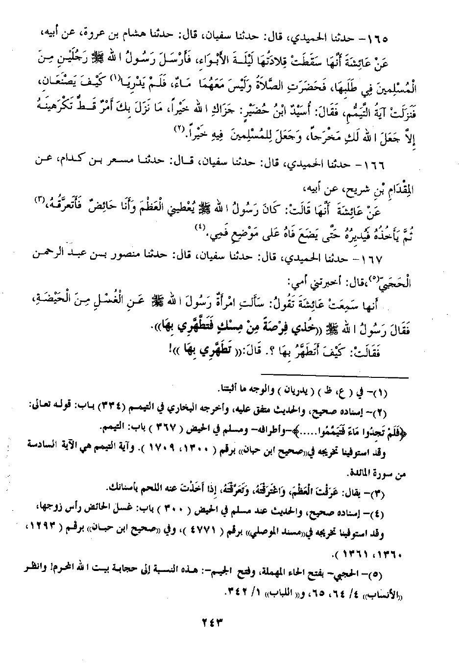 167 - حَدَّثَنَا الْحُمَيْدِيُّ قَالَ: ثنا سُفْيَانُ قَالَ: ثنا مَنْصُورُ بْنُ عَبْدِ الرَّحْمَنِ الْحَجَبِيُّ قَالَ: أَخْبَرَتْنِي أُمِّي أَنَّهَا سَمِعَتْ عَائِشَةَ تَقُولُ: سَأَلَتِ امْرَأَةٌ رَسُولَ اللَّهِ صَلَّى اللهُ عَلَيْهِ وَسَلَّمَ عَنِ الْغُسْلِ فِي الْحَيْضَةِ فَقَالَ رَسُولُ اللَّهِ صَلَّى اللهُ عَلَيْهِ وَسَلَّمَ: «§خُذِي فِرْصَةً مِنْ مِسْكٍ فَتَطَهَّرِي بِهَا» فَقَالَتْ: كَيْفَ أَتَطَهَّرُ بِهَا؟ قَالَ: «تَطَهَّرِي بِهَا» قَالَ قُلْتُ: كَيْفَ أَتَطَهَّرُ بِهَا؟ فَقَالَ بِيَدِهِ هَكَذَا: «سُبْحَانَ اللَّهِ تَطَهَّرِي بِهَا -[244]- وَاسْتَتَرَ بِثَوْبِهِ» قَالَتْ عَائِشَةُ: فَعَرَفَتُ الَّذِي أَرَادَ فَاجْتَذَبْتُهَا، وَقُلْتُ لَهَا: تَتَبَّعِي بِهَا أَثَرَ الدَّمِ