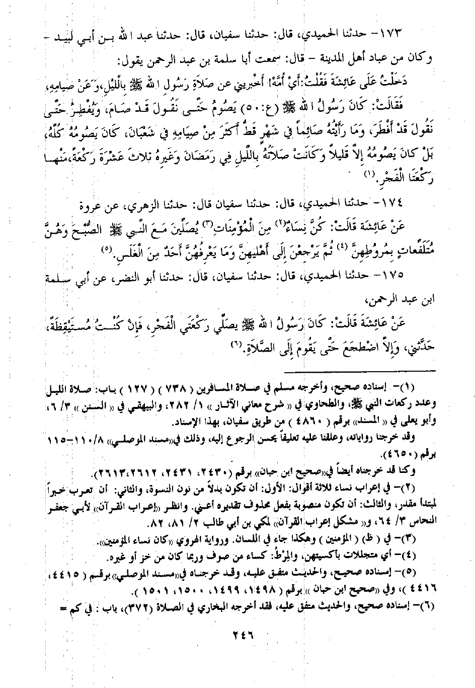 173 - حَدَّثَنَا الْحُمَيْدِيُّ قَالَ: ثنا سُفْيَانُ قَالَ: ثنا عَبْدُ اللَّهِ بْنُ أَبِي لَبِيدٍ وَكَانَ مِنْ عُبَّادِ أَهْلِ الْمَدِينَةِ قَالَ: سَمِعْتُ أَبَا سَلَمَةَ بْنَ عَبْدِ الرَّحْمَنِ يَقُولُ: دَخَلْتُ عَلَى عَائِشَةَ فَقُلْتُ: أَيْ أُمَّهْ أَخْبِرِينِي عَنْ صَلَاةِ رَسُولِ اللَّهِ صَلَّى اللهُ عَلَيْهِ وَسَلَّمَ بِاللَّيْلِ وَعَنْ صِيَامِهِ فَقَالَتْ: «كَانَ رَسُولُ اللَّهِ صَلَّى اللهُ عَلَيْهِ وَسَلَّمَ §يَصُومُ حَتَّى نَقُولَ قَدْ صَامَ، وَيُفْطِرُ حَتَّى نَقُولَ قَدْ أَفْطَرَ، وَمَا رَأَيْتُهُ صَائِمًا فِي شَهْرٍ قَطُّ أَكْثَرَ مِنْ صِيَامِهِ فِي شَعْبَانَ، كَانَ يَصُومُهُ كُلَّهُ، بَلْ كَانَ يَصُومُهُ إِلَّا قَلِيلًا، وَكَانَتْ صَلَاتُهُ بِاللَّيْلِ فِي رَمَضَانَ وَغَيْرِهِ ثَلَاثَ عَشْرَةَ رَكْعَةً مِنْهَا رَكْعَتَيِ الْفَجْرِ»