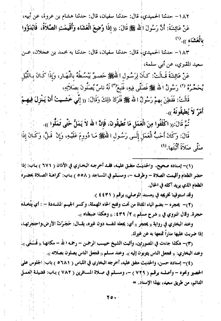 183 - حَدَّثَنَا الْحُمَيْدِيُّ قَالَ: ثنا سُفْيَانُ قَالَ: ثنا بِهِ مُحَمَّدُ بْنُ عَجْلَانَ، عَنْ سَعِيدٍ الْمَقْبُرِيِّ، عَنْ أَبِي سَلَمَةَ، عَنْ عَائِشَةَ قَالَتْ: كَانَ لِرَسُولِ اللَّهِ صَلَّى اللهُ عَلَيْهِ وَسَلَّمَ حَصِيرٌ يَبْسُطُهُ بِالنَّهَارِ، وَإِذَا كَانَ بِاللَّيْلِ يُحَجِّزُهُ رَسُولُ اللَّهِ صَلَّى اللهُ عَلَيْهِ وَسَلَّمَ فَصَلَّى فِيهِ، فَسَعَى لَهُ نَاسٌ يُصَلُّونَ بِصَلَاتِهِ، قَالَ: فَفَطِنَ فِيهِمْ رَسُولُ اللَّهِ صَلَّى اللهُ عَلَيْهِ وَسَلَّمَ فَتَرَكَ ذَلِكَ، وَقَالَ: «إِنِّي حَسِبْتُ أَنْ يَنْزِلَ فِيهِمْ أَمْرٌ لَا يُطِيقُونَهُ» ثُمَّ قَالَ: «§اكْلَفُوا مِنَ الْعَمَلِ مَا تُطِيقُونَ فَإِنَّ اللَّهَ لَا يَمَلُّ حَتَّى تَمَلُّوا» قَالَ: وَكَانَ أَحَبَّ الْعَمَلِ إِلَى رَسُولِ اللَّهِ صَلَّى اللهُ عَلَيْهِ وَسَلَّمَ مَا دُومَ عَلَيْهِ وَإِنْ قَلَّ، وَكَانَ إِذَا صَلَّى صَلَاةً أَثْبَتَهَا