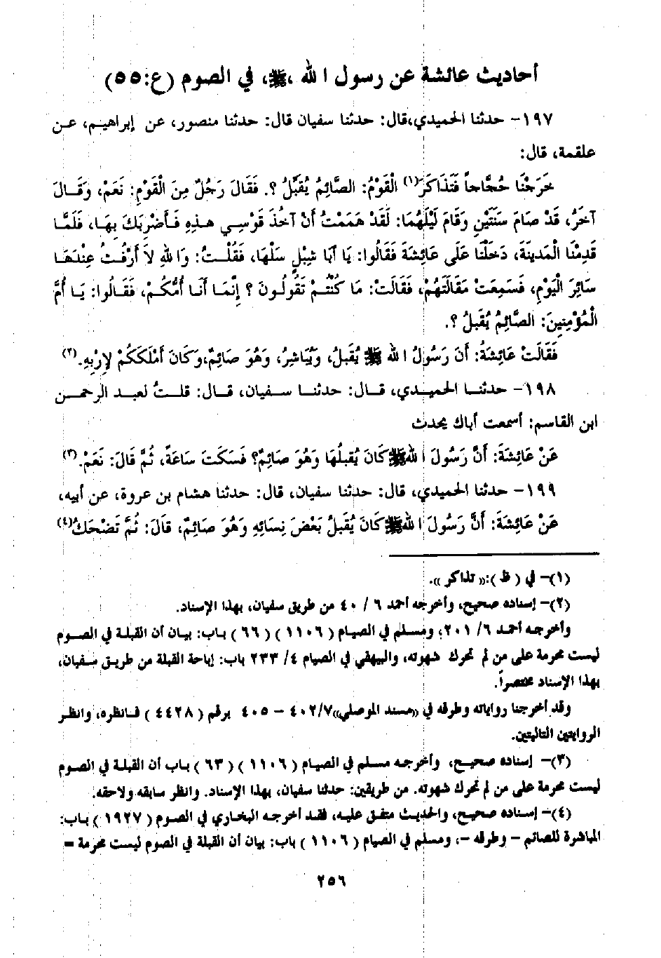 198 - حَدَّثَنَا الْحُمَيْدِيُّ قَالَ: ثنا سُفْيَانُ قَالَ قُلْتُ لِعَبْدِ الرَّحْمَنِ بْنِ الْقَاسِمِ أَسَمِعْتَ أَبَاكَ يُحَدِّثُ عَنْ عَائِشَةَ «§أَنَّ رَسُولَ اللَّهِ صَلَّى اللهُ عَلَيْهِ وَسَلَّمَ كَانَ يُقَبِّلُهَا وَهُوَ صَائِمٌ؟» فَسَكَتَ سَاعَةً ثُمَّ قَالَ: نَعَمْ