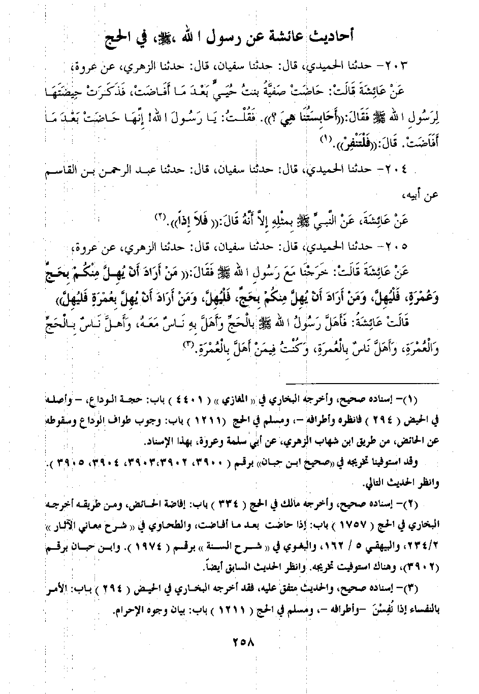 203 - حَدَّثَنَا الْحُمَيْدِيُّ قَالَ: ثنا سُفْيَانُ قَالَ: ثنا الزُّهْرِيُّ، عَنْ عُرْوَةَ، عَنْ عَائِشَةَ قَالَتْ: حَاضَتْ صَفِيَّةُ بِنْتُ حُيَيٍّ بَعْدَ مَا أَفَاضَتْ فَذَكَرْتُ حَيْضَتَهَا لِرَسُولِ اللَّهِ صَلَّى اللهُ عَلَيْهِ وَسَلَّمَ فَقَالَ «§أَحَابِسَتُنَا هِيَ» فَقُلْتُ: يَا رَسُولَ اللَّهِ إِنَّهَا حَاضَتْ بَعْدَ مَا أَفَاضَتْ، قَالَ: «فَلْتَنْفُرْ»
