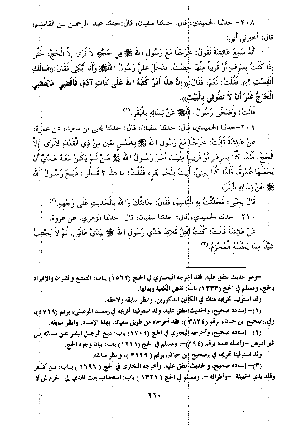 208 - حَدَّثَنَا الْحُمَيْدِيُّ قَالَ: ثنا سُفْيَانُ قَالَ: ثنا عَبْدُ الرَّحْمَنِ بْنُ الْقَاسِمِ قَالَ: أَخْبَرَنِي أَبِي أَنَّهُ سَمِعَ عَائِشَةَ تَقُولُ: «خَرَجْنَا مَعَ رَسُولِ اللَّهِ صَلَّى اللهُ عَلَيْهِ وَسَلَّمَ فِي حِجَّتِهِ لَا نَرَى إِلَّا الْحَجَّ حَتَّى إِذَا كُنْتُ بِسَرَفٍ أَوْ قَرِيبًا مِنْهَا حِضْتُ، فَدَخَلَ عَلَيَّ رَسُولُ اللَّهِ صَلَّى اللهُ عَلَيْهِ وَسَلَّمَ وَأَنَا أَبْكِي فَقَالَ» مَالَكِ أَنَفِسْتِ؟ " فَقُلْتُ: نَعَمْ، فَقَالَ «§إِنَّ هَذَا أَمْرٌ كَتَبَهُ اللَّهُ عَلَى بَنَاتِ آدَمَ فَاقْضِي مَا يَقْضِي الْحَاجُّ غَيْرَ أَنْ لَا تَطُوفِي بِالْبَيْتِ» قَالَتْ: «وَضَحَّى رَسُولُ اللَّهِ صَلَّى اللهُ عَلَيْهِ وَسَلَّمَ عَنْ نِسَائِهِ بِالْبَقَرِ»