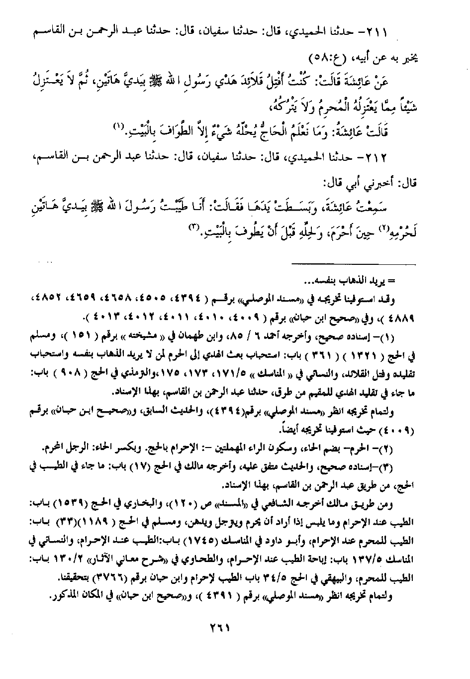 211 - حَدَّثَنَا الْحُمَيْدِيُّ قَالَ: نا سُفْيَانُ قَالَ: نا عَبْدُ الرَّحْمَنِ بْنُ الْقَاسِمِ يُخْبِرُ بِهِ عَنْ أَبِيهِ، عَنْ عَائِشَةَ قَالَتْ: «§كُنْتُ أَفْتِلُ قَلَائِدَ هَدْيِ رَسُولِ اللَّهِ صَلَّى اللهُ عَلَيْهِ وَسَلَّمَ بِيَدَيَّ هَاتَيْنِ ثُمَّ لَا يَعْتَزِلُ شَيْئًا مِمَّا يَعْتَزِلُهُ الْمُحْرِمُ وَلَا يَتْرُكُهُ» قَالَتْ عَائِشَةُ: وَمَا نَعْلَمُ الْحَاجَّ يُحِلُّهُ شَيْءٌ إِلَّا الطَّوَافُ بِالْبَيْتِ