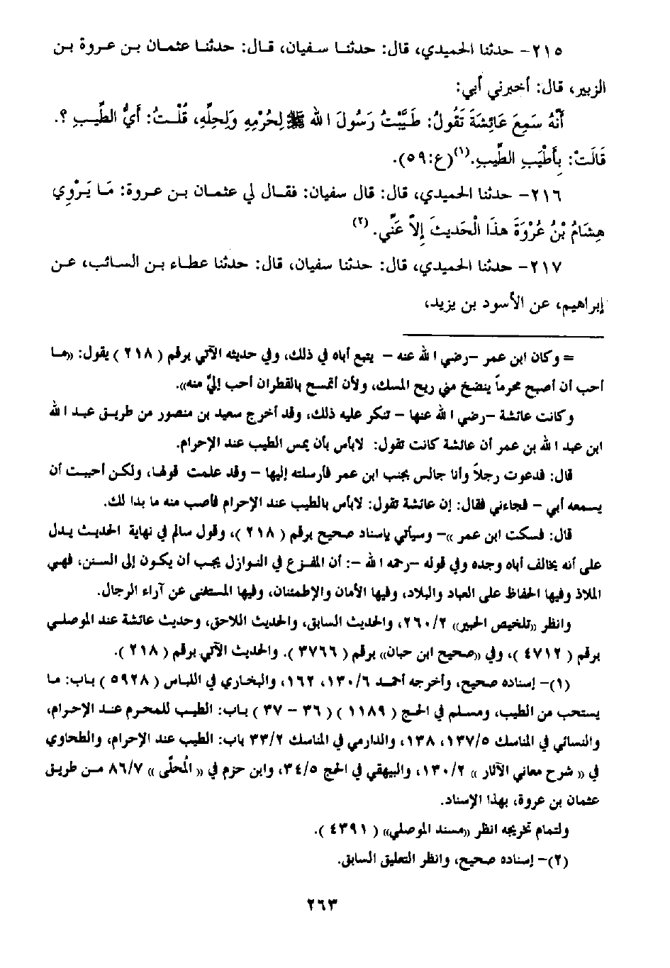 215 - حَدَّثَنَا الْحُمَيْدِيُّ قَالَ: ثنا سُفْيَانُ قَالَ: ثني عُثْمَانُ بْنُ عُرْوَةَ بْنِ الزُّبَيْرِ قَالَ: أَخْبَرَنِي أَبِي أَنَّهُ سَمِعُ عَائِشَةَ تَقُولُ: «§طَيَّبْتُ رَسُولَ اللَّهِ صَلَّى اللهُ عَلَيْهِ وَسَلَّمَ لِحَرَمِهِ وَحِلِّهِ» قُلْتُ: أَيُّ الطِّيبِ؟ قَالَتْ: بَأَطْيَبِ الطِّيبِ