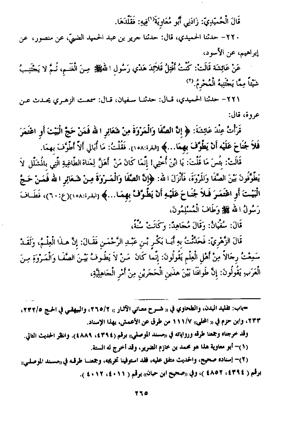 221 - حَدَّثَنَا الْحُمَيْدِيُّ قَالَ: ثنا سُفْيَانُ قَالَ: سَمِعْتُ الزُّهْرِيَّ يُحَدِّثُ عَنْ عُرْوَةَ قَالَ: قَرَأْتُ عِنْدَ عَائِشَةَ {§إِنَّ الصَّفَا وَالْمَرْوَةَ مِنْ شَعَائِرِ اللَّهِ فَمَنْ حَجَّ الْبَيْتَ أَوِ اعْتَمَرَ فَلَا جُنَاحَ عَلَيْهِ أَنْ يَطَّوَّفَ بِهِمَا} [البقرة: 158] فَقُلْتُ: مَا أُبَالِي أَلَّا أَطَّوَّفَ بِهِمَا، قَالَتْ: بِئْسَمَا قُلْتَ يَا ابْنَ أُخْتِي إِنَّمَا كَانَ مَنْ أَهَلَّ لِمَنَاةَ الطَّاغِيَةِ الَّتِي بِالْمُشَلَّلِ لَا يَطُوفُونَ بَيْنَ الصَّفَا وَالْمَرْوَةِ فَأَنْزَلَ اللَّهُ {إِنَّ الصَّفَا وَالْمَرْوَةَ مِنْ شَعَائِرِ اللَّهِ فَمَنْ حَجَّ الْبَيْتَ أَوِ اعْتَمَرَ فَلَا جُنَاحَ عَلَيْهِ أَنْ يَطَّوَّفَ بِهِمَا} [البقرة: 158] «فَطَافَ رَسُولُ اللَّهِ صَلَّى اللهُ عَلَيْهِ وَسَلَّمَ وَطَافَ الْمُسْلِمُونَ»