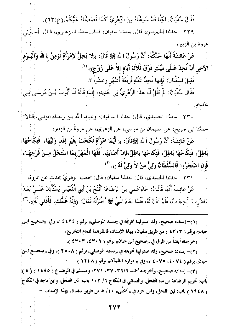 229 - حَدَّثَنَا الْحُمَيْدِيُّ قَالَ: ثنا سُفْيَانُ قَالَ: ثنا الزُّهْرِيُّ قَالَ: أَخْبَرَنِي عُرْوَةُ بْنُ الزُّبَيْرِ، عَنْ عَائِشَةَ أَنَّهَا حَدَّثَتْهُ أَنَّ رَسُولَ اللَّهِ صَلَّى اللهُ عَلَيْهِ وَسَلَّمَ قَالَ: «§لَا يَحِلُّ لِامْرَأَةٍ تُؤْمِنُ بِاللَّهِ وَالْيَوْمِ الْآخِرِ أَنْ تُحِدَّ عَلَى مَيِّتٍ فَوْقَ ثَلَاثَةِ أَيَّامٍ إِلَّا عَلَى زَوْجٍ» فَقِيلَ لِسُفْيَانَ: فَإِنَّهَا تُحِدُّ عَلَيْهِ أَرْبَعَةَ أَشْهُرٍ وَعَشْرًا، فَقَالَ سُفْيَانُ لَمْ يَقُلْ لَنَا هَذَا الزُّهْرِيُّ فِي حَدِيثِهِ، إِنَّمَا قَالَهُ لَنَا أَيُّوبُ بْنُ مُوسَى فِي حَدِيثِهِ