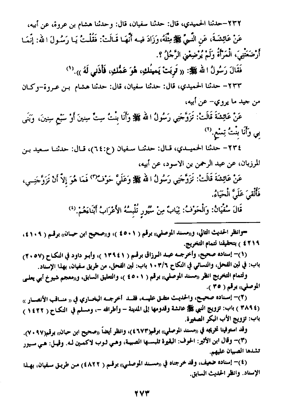 233 - حَدَّثَنَا الْحُمَيْدِيُّ قَالَ: ثنا سُفْيَانُ قَالَ: ثنا هِشَامُ بْنُ عُرْوَةَ وَكَانَ مِنْ جَيِّدِ مَا يَرْوِيهِ عَنْ أَبِيهِ، عَنْ عَائِشَةَ قَالَتْ: «§تَزَوَّجَنِي رَسُولُ اللَّهِ صَلَّى اللهُ عَلَيْهِ وَسَلَّمَ وَأَنَا بِنْتُ سِتِّ سِنِينَ أَوْ سَبْعِ سِنِينَ، وَبَنَى بِي وَأَنَا بِنْتُ تِسْعٍ»