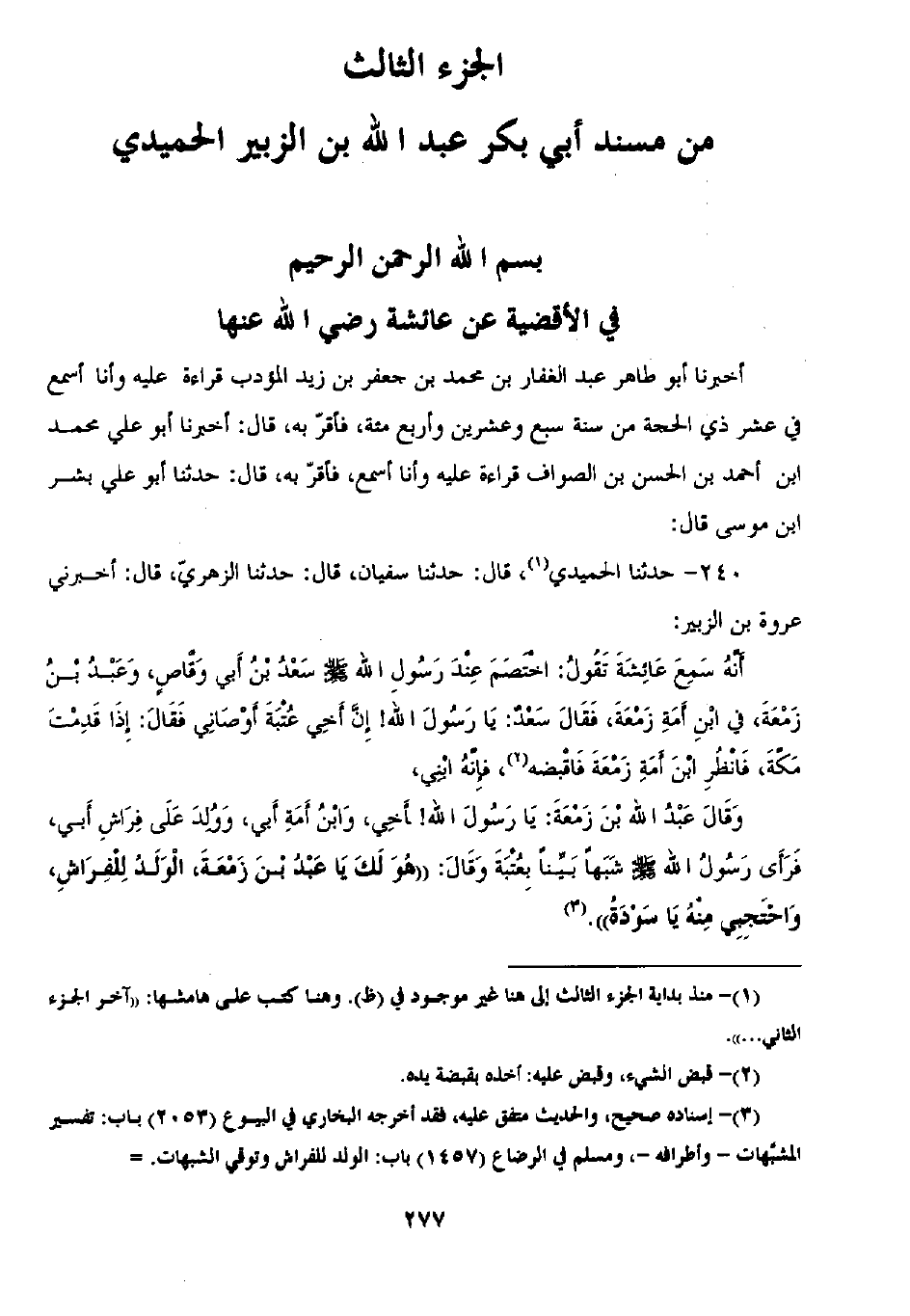 240 - حَدَّثَنَا الْحُمَيْدِيُّ قَالَ: ثنا سُفْيَانُ قَالَ: ثنا الزُّهْرِيُّ قَالَ: أَخْبَرَنِي عُرْوَةُ بْنُ الزُّبَيْرِ أَنَّهُ سَمِعَ عَائِشَةَ تَقُولُ: اخْتَصَمَ عِنْدَ رَسُولِ اللَّهِ صَلَّى اللهُ عَلَيْهِ وَسَلَّمَ سَعْدُ بْنُ أَبِي وَقَّاصٍ وَعَبْدُ اللَّهِ بْنُ زَمْعَةَ فِي ابْنِ أَمَةِ زَمْعَةَ فَقَالَ سَعْدٌ: يَا رَسُولَ اللَّهِ إِنَّ أَخِي عُتْبَةَ أَوْصَانِي فَقَالَ: إِذَا قَدِمْتَ مَكَّةَ فَانْظُرِ ابْنَ أَمَةِ زَمْعَةَ فَاقْبِضْهُ فَإِنَّهُ ابْنِي، وَقَالَ عَبْدُ اللَّهِ بْنُ زَمْعَةَ: يَا رَسُولَ اللَّهِ أَخِي وَابْنُ أَمَةِ أَبِي، وَوُلِدَ عَلَى فِرَاشِ أَبِي فَرَأَى رَسُولُ اللَّهِ صَلَّى اللهُ عَلَيْهِ وَسَلَّمَ شَبَهًا بَيِّنًا بِعُتْبَةَ وَقَالَ: «هُوَ لَكَ يَا عَبْدُ بْنَ زَمْعَةَ §الْوَلَدُ لِلْفِرَاشِ وَاحْتَجِبِي مِنْهُ يَا سَوْدَةُ» -[278]- فَقِيلَ لِسُفْيَانَ فَإِنَّ مَالِكًا يَقُولُ: وَلِلْعَاهِرِ الْحَجَرُ، فَقَالَ سُفْيَانُ لَكِنَّا لَمْ نَحْفَظْ عَنِ الزُّهْرِيِّ أَنَّهُ قَالَ فِي هَذَا الْحَدِيثِ