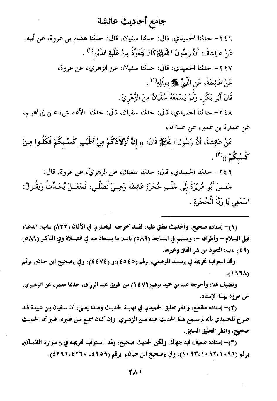 248 - حَدَّثَنَا الْحُمَيْدِيُّ قَالَ: ثنا سُفْيَانُ قَالَ: ثنا الْأَعْمَشُ، عَنْ إِبْرَاهِيمَ، عَنْ عُمَارَةَ بْنِ عُمَيْرٍ، عَنْ عَمَّةٍ لَهُ، عَنْ عَائِشَةَ أَنَّ رَسُولَ اللَّهِ صَلَّى اللهُ عَلَيْهِ وَسَلَّمَ قَالَ: «§إِنَّ أَوْلَادَكُمْ مِنْ أَطْيَبِ كَسْبِكُمْ فَكُلُوا مِنْ كَسْبِكُمْ»
