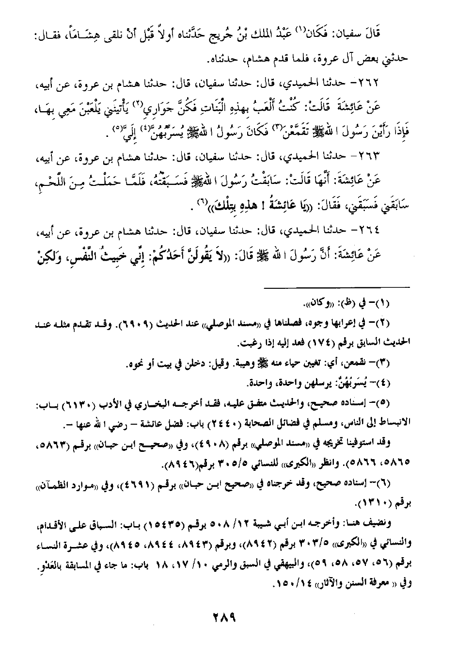 262 - حَدَّثَنَا الْحُمَيْدِيُّ قَالَ: ثنا سُفْيَانُ قَالَ: ثنا هِشَامُ بْنُ عُرْوَةَ، عَنْ أَبِيهِ، عَنْ عَائِشَةَ قَالَتْ: كُنْتُ الْعَبُ بِهَذِهِ الْبَنَاتِ، وَكُنَّ جَوَارِيَ يَأْتِيَنِّي يَلْعَبْنَ مَعِي بِهَا، فَلَمَّا رَأَيْنَ رَسُولَ اللَّهِ صَلَّى اللهُ عَلَيْهِ وَسَلَّمَ تَقَمَّعْنَ «§فَكَانَ رَسُولُ اللَّهِ صَلَّى اللهُ عَلَيْهِ وَسَلَّمَ يُسَرِّبُهُنَّ إِلِيَّ»