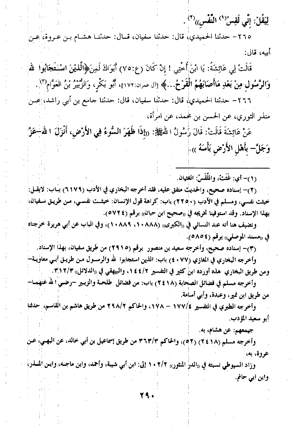 265 - حَدَّثَنَا الْحُمَيْدِيُّ قَالَ: ثنا سُفْيَانُ قَالَ: ثنا هِشَامُ بْنُ عُرْوَةَ، عَنْ أَبِيهِ قَالَ: قَالَتْ لِي عَائِشَةُ: «يَا ابْنَ أُخْتِي §إِنْ كَانَ أَبَوَاكَ لَمِنَ الَّذِينَ اسْتَجَابُوا لِلَّهِ وَالرَّسُولِ مِنْ بَعْدِ مَا أصَابَهُمُ الْقَرْحُ. . . . . أَبُو بَكْرٍ، وَالزُّبَيْرُ بْنُ الْعَوَّامِ»
