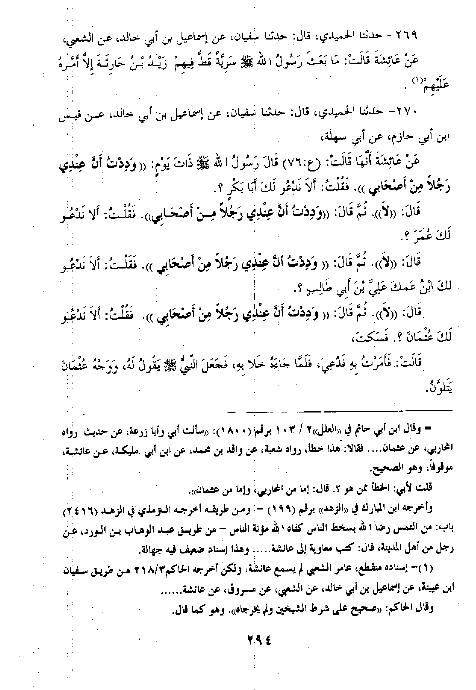270 - حَدَّثَنَا الْحُمَيْدِيُّ قَالَ: ثنا سُفْيَانُ، عَنْ إِسْمَاعِيلَ بْنِ أَبِي خَالِدٍ، عَنْ قَيْسِ بْنِ أَبِي حَازِمٍ، عَنْ أَبِي سَهْلَةَ، عَنْ عَائِشَةَ أَنَّهَا قَالَتْ: قَالَ رَسُولُ اللَّهِ صَلَّى اللهُ عَلَيْهِ وَسَلَّمَ ذَاتَ يَوْمٍ «وَدِدْتُ أَنَّ عِنْدِي رَجُلًا مِنْ أَصْحَابِي» فَقُلْتُ: أَلَا نَدْعُو لَكَ أَبَا بَكْرٍ؟ قَالَ «لَا» ثُمَّ قَالَ «وَدِدْتُ أَنَّ عِنْدِي رَجُلًا مِنْ أَصْحَابِي» فَقُلْتُ أَلَا نَدْعُو لَكَ عُمَرَ؟ قَالَ «لَا» ثُمَّ قَالَ «وَدِدْتُ أَنَّ عِنْدِي رَجُلًا مِنْ أَصْحَابِي» فَقُلْتُ: أَلَا نَدْعُو لَكَ ابْنَ عَمِّكَ عَلِيَّ بْنَ أَبِي طَالِبٍ؟ قَالَ: «لَا» ثُمَّ قَالَ: «وَدِدْتُ أَنَّ عِنْدِي رَجُلًا مِنْ أَصْحَابِي» فَقُلْتُ: أَلَا نَدْعُو لَكَ عُثْمَانَ؟ فَسَكَتَ، قَالَتْ: فَأَمَرْتُ بِهِ فَدُعِيَ فَلَمَّا جَاءَهُ خَلَا بِهِ، فَجَعَلَ النَّبِيُّ صَلَّى اللهُ عَلَيْهِ وَسَلَّمَ يَقُولُ لَهُ وَوَجْهُ عُثْمَانَ يَتَلَوَّنُ -[295]- قَالَ سُفْيَانُ: وَحَدَّثُونِي، عَنِ ابْنِ أَبِي خَالِدٍ عَنْ قَيْسٍ عَنْ أَبِي سَهْلَةَ فَقَالَتْ عَائِشَةُ فِي هَذَا الْحَدِيثِ: فَلَمْ أَحْفَظْ مِنْ قَوْلِهِ إِلَّا أَنَّهُ قَالَ «§وَإِنْ سَأَلُوكَ أَنْ تَنْخَلِعَ مِنْ قَمِيصٍ قَمَّصَكَ اللَّهُ عَزَّ وَجَلَّ فَلَا تَفْعَلْ»