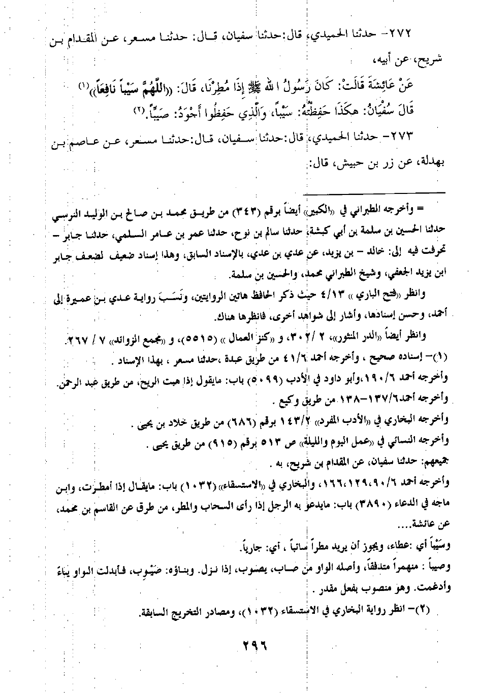 272 - حَدَّثَنَا الْحُمَيْدِيُّ قَالَ: ثنا سُفْيَانُ قَالَ: ثنا مِسْعَرٌ، عَنْ أَبِيهِ، عَنْ عَائِشَةَ قَالَتْ: كَانَ رَسُولُ اللَّهِ صَلَّى اللهُ عَلَيْهِ وَسَلَّمَ §إِذَا مُطِرْنَا قَالَ: «اللَّهُمَّ سَيِّبًا نَافِعًا» قَالَ سُفْيَانُ هَكَذَا حَفِظْتُهُ سَيِّبًا، وَالَّذِي حَفِظُوا أَجْوَدُ صَيِّبًا
