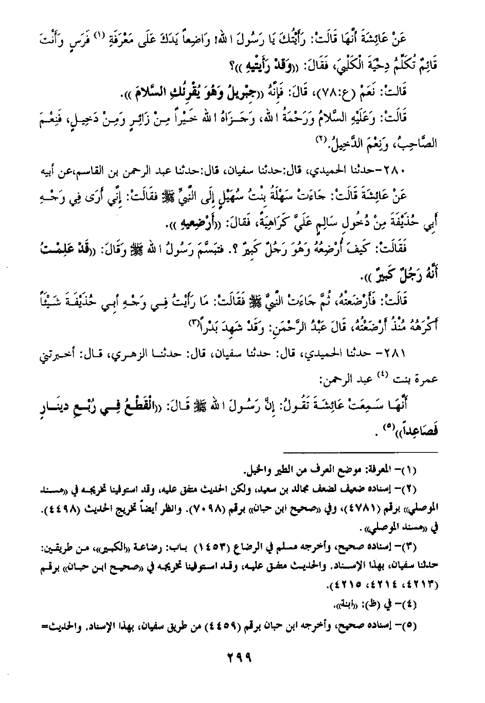 281 - حَدَّثَنَا الْحُمَيْدِيُّ قَالَ: ثنا سُفْيَانُ قَالَ: ثنا الزُّهْرِيُّ قَالَ: أَخْبَرَتْنِي عَمْرَةُ بِنْتُ عَبْدِ الرَّحْمَنِ أَنَّهَا سَمِعَتْ عَائِشَةَ تَقُولُ: إِنَّ رَسُولَ اللَّهِ صَلَّى اللهُ عَلَيْهِ وَسَلَّمَ قَالَ: «§الْقَطْعُ فِي رُبْعِ دِينَارٍ فَصَاعِدًا»
