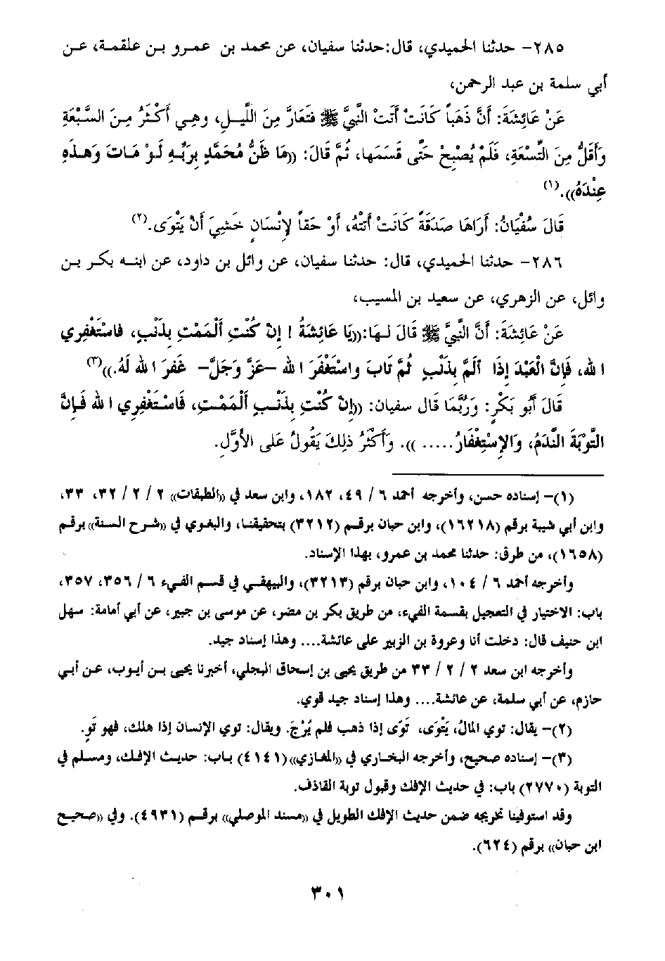 285 - حَدَّثَنَا الْحُمَيْدِيُّ قَالَ: ثنا سُفْيَانُ، عَنْ مُحَمَّدِ بْنِ عَمْرِو بْنِ عَلْقَمَةَ، عَنْ أَبِي سَلَمَةَ بْنِ عَبْدِ الرَّحْمَنِ، عَنْ عَائِشَةَ أَنَّ ذَهَبًا كَانَتْ أَتَتِ النَّبِيَّ صَلَّى اللهُ عَلَيْهِ وَسَلَّمَ فَتَعَارَّ مِنَ اللَّيْلِ وَهِيَ أَكْثَرُ مِنَ السَّبِعَةِ وَأَقَلُّ مِنَ التِّسْعَةِ فَلَمْ يُصْبِحْ حَتَّى قَسَّمَهَا ثُمَّ قَالَ: «§مَا ظَنُّ مُحَمَّدٍ بِرَبِّهِ لَوْ مَاتَ وَهَذِهِ عِنْدَهُ » قَالَ سُفْيَانُ: أُرَاهَا صَدَقَةً كَانَتْ أَتَتْهُ أَوْ حَقًّا لِإِنْسَانٍ خَشِيَ أَنْ يَتْوَى