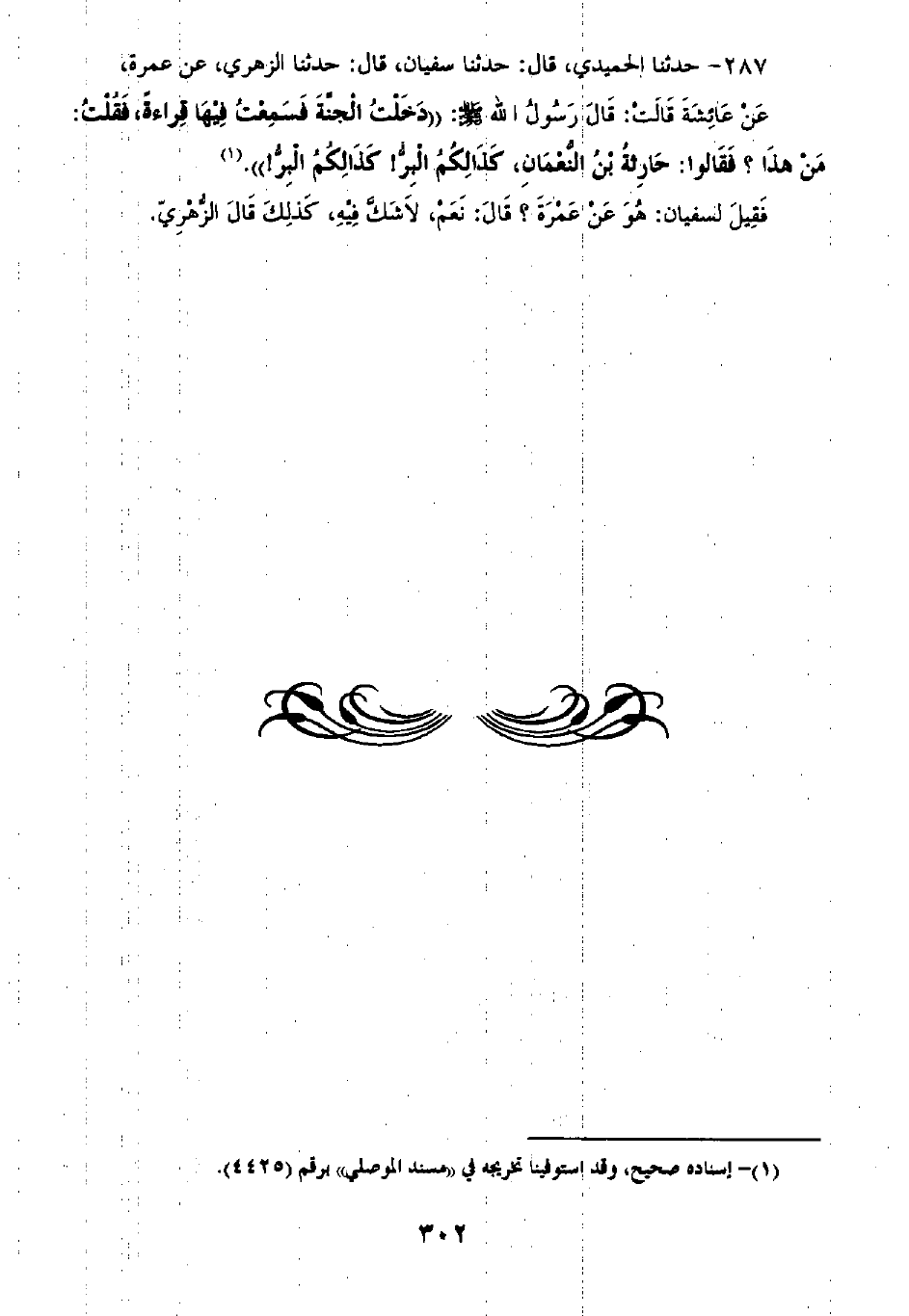 287 - حَدَّثَنَا الْحُمَيْدِيُّ قَالَ: ثنا سُفْيَانُ قَالَ: ثنا الزُّهْرِيُّ، عَنْ عَمْرَةَ، عَنْ عَائِشَةَ قَالَتْ: قَالَ رَسُولُ اللَّهِ صَلَّى اللهُ عَلَيْهِ وَسَلَّمَ: " §دَخَلْتُ الْجَنَّةَ فَسَمِعْتُ فِيهَا قِرَاءَةً، فَقُلْتُ: «مَنْ هَذَا؟» فَقَالُوا: حَارِثَةُ بْنُ النُّعْمَانِ «كَذَالِكُمُ الْبِرُّ، كَذَالِكُمُ الْبِرُّ» فَقِيلَ لِسُفْيَانَ: هُوَ عَنْ عَمْرَةَ؟ قَالَ: نَعَمْ لَا شَكَّ فِيهِ كَذَلِكَ قَالَ الزُّهْرِيُّ