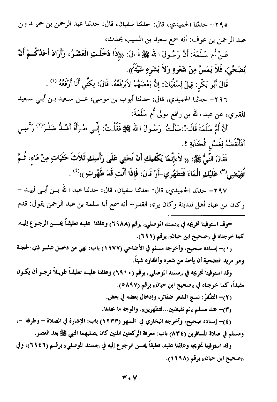 295 - حَدَّثَنَا الْحُمَيْدِيُّ قَالَ: ثنا سُفْيَانُ قَالَ: ثنا عَبْدُ الرَّحْمَنِ بْنُ حُمَيْدِ بْنِ عَبْدِ الرَّحْمَنِ بْنِ عَوْفٍ أَنَّهُ سَمِعَ سَعِيدَ بْنَ الْمُسَيِّبِ يُحَدِّثُ عَنْ أُمِّ سَلَمَةَ أَنَّ رَسُولَ اللَّهِ صَلَّى اللهُ عَلَيْهِ وَسَلَّمَ قَالَ: «§إِذَا دَخَلَتِ الْعَشْرُ وَأَرَادَ أَحَدُكُمْ أَنْ يُضَحِّيَ فَلَا يَمَسَّ مِنْ شَعْرِهِ، وَلَا بَشَرِهِ شَيْئًا» قَالَ أَبُو بَكْرٍ قِيلَ لِسُفْيَانَ: إِنَّ بَعْضَهُمْ لَا يَرْفَعُهُ قَالَ: لَكِنِّي أَنَا أَرْفَعُهُ