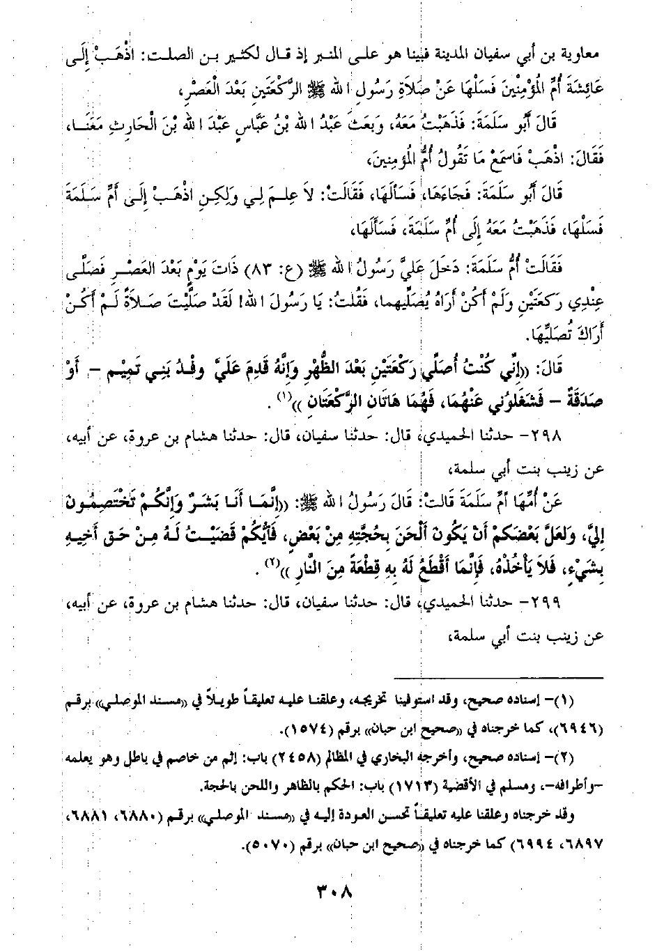 298 - حَدَّثَنَا الْحُمَيْدِيُّ قَالَ: ثنا سُفْيَانُ قَالَ: ثنا هِشَامُ بْنُ عُرْوَةَ، عَنْ أَبِيهِ، عَنْ زَيْنَبَ بِنْتِ أَبِي سَلَمَةَ، عَنْ أُمِّهَا أُمِّ سَلَمَةَ قَالَتْ: قَالَ رَسُولُ اللَّهِ صَلَّى اللهُ عَلَيْهِ وَسَلَّمَ: «§إِنَّمَا أَنَا بَشَرٌ وَإِنَّكُمْ تَخْتَصِمُونَ إِلَيَّ، وَلَعَلَّ بَعْضَكُمْ أَنْ يَكُونَ أَلْحَنَ بِحُجَّتِهِ مِنْ بَعْضٍ فَأَيُّكُمْ قَضَيْتُ لَهُ مِنْ حَقِّ أَخِيهِ بِشَيْءٍ فَلَا يَأْخُذْ بِهِ؛ فَإِنَّمَا أَقْطَعُ لَهُ بِهِ قِطْعَةً مِنَ النَّارِ»