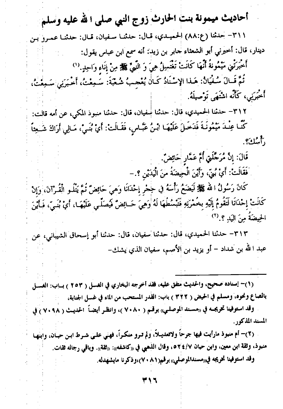 312 - حَدَّثَنَا الْحُمَيْدِيُّ قَالَ: ثنا سُفْيَانُ قَالَ: ثنا مَنْبُوذٌ الْمَكِّيُّ، عَنْ أُمِّهِ قَالَتْ: كُنَّا عِنْدَ مَيْمُونَةَ فَدَخَلَ عَلَيْهَا ابْنُ عَبَّاسٍ فَقَالَتْ: أَيْ بُنَيَّ مَالِي أَرَاكَ شَعِثًا رَأْسُكَ؟ قَالَ: إِنَّ مُرَجِّلَتِي أُمَّ عَمَّارٍ حَايِضٌ فَقَالَتْ: أَيْ بُنَيَّ وَأَيْنَ الْحَيْضَةُ مِنَ الْيَدَيْنِ؟ «كَانَ رَسُولُ اللَّهِ صَلَّى اللهُ عَلَيْهِ وَسَلَّمَ §لَيَضَعُ رَأْسَهُ فِي حِجْرِ إِحْدَانَا وَهِيَ حَائِضٌ ثُمَّ يَتْلُو الْقُرْآنَ، وَإِنْ كَانَتْ إِحْدَانَا لَتَقُومُ إِلَيْهِ بِخُمْرَتِهِ فَتَبْسُطُهَا لَهُ وَهِيَ حَائِضٌ فَيُصَلِّي عَلَيْهَا» أَيْ بُنَيَّ فَأَيْنَ الْحَيْضَةُ مِنَ الْيَدِ؟