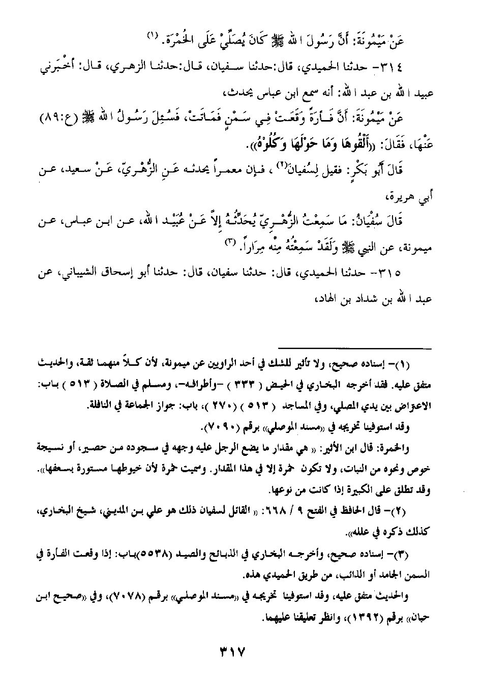 314 - حَدَّثَنَا الْحُمَيْدِيُّ قَالَ: ثنا سُفْيَانُ قَالَ: ثنا الزُّهْرِيُّ قَالَ: أَخْبَرَنِي عُبَيْدُ اللَّهِ بْنُ عَبْدِ اللَّهِ أَنَّهُ سَمِعَ ابْنَ عَبَّاسٍ يُحَدِّثُ عَنْ مَيْمُونَةَ أَنَّ §فَأْرَةً وَقَعَتْ فِي سَمْنٍ فَمَاتَتْ، فَسُئِلَ رَسُولُ اللَّهِ صَلَّى اللهُ عَلَيْهِ وَسَلَّمَ عَنْهَا، فَقَالَ: «أَلْقُوهَا وَمَا حَوْلَهَا وَكُلُوهُ» قَالَ أَبُو بَكْرٍ: فَقِيلَ لِسُفْيَانَ فَإِنَّ مَعْمَرًا يُحَدِّثُهُ، عَنِ الزُّهْرِيِّ، عَنْ سَعِيدٍ، عَنْ أَبِي هُرَيْرَةَ قَالَ سُفْيَانُ: مَا سَمِعْتُ الزُّهْرِيَّ يُحَدِّثُهُ إِلَّا عَنْ عُبَيْدِ اللَّهِ، عَنِ ابْنِ عَبَّاسٍ، عَنْ مَيْمُونَةَ، عَنِ النَّبِيِّ صَلَّى اللهُ عَلَيْهِ وَسَلَّمَ وَلَقَدْ سَمِعْتُهُ مِنْهُ مِرَارًا