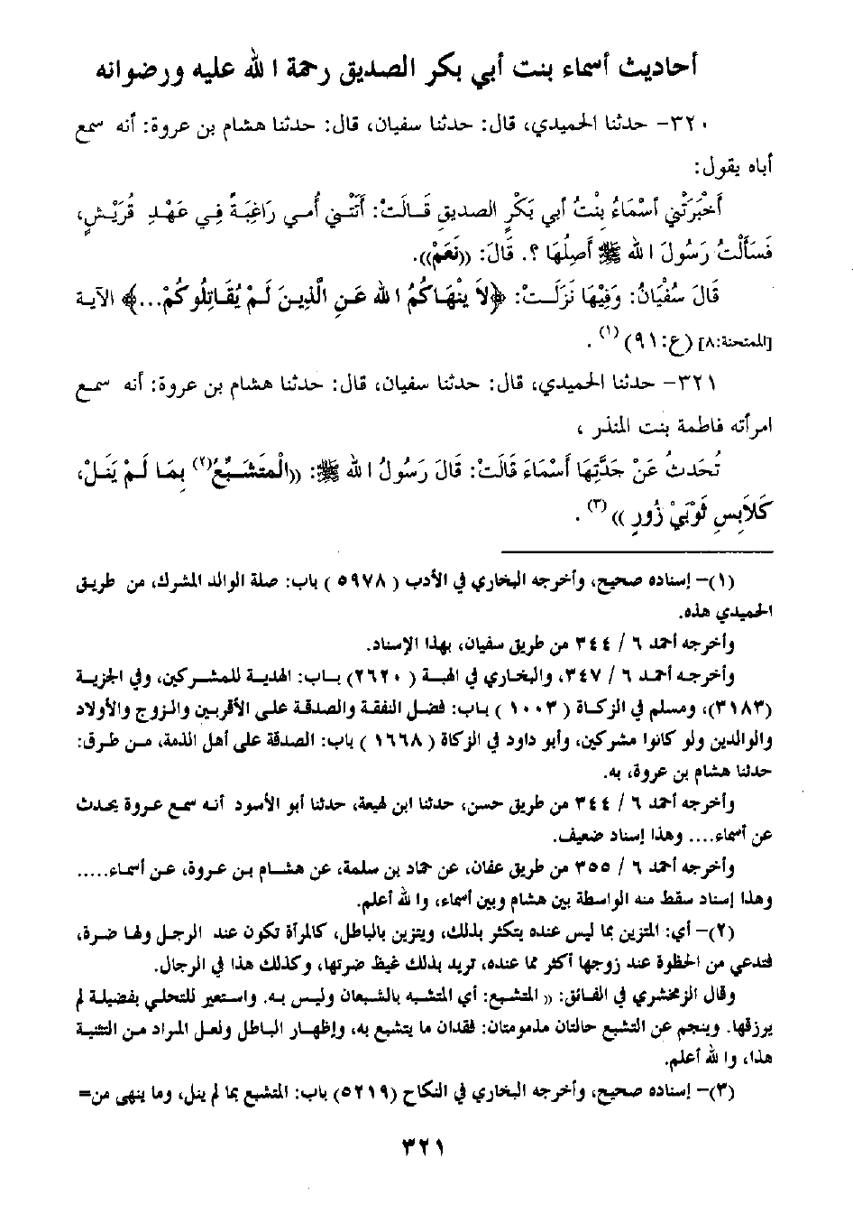 320 - حَدَّثَنَا الْحُمَيْدِيُّ قَالَ: ثنا سُفْيَانُ قَالَ: ثنا هِشَامُ بْنُ عُرْوَةَ أَنَّهُ سَمِعَ أَبَاهُ يَقُولُ: أَخْبَرَتْنِي أَسْمَاءُ بِنْتُ أَبِي بَكْرٍ الصِّدِّيقِ قَالَتْ: أَتَتْنِي أُمِّي رَاغِبَةً فِي عَهْدِ قُرَيْشٍ فَسَأَلْتُ رَسُولَ اللَّهِ صَلَّى اللهُ عَلَيْهِ وَسَلَّمَ أَصِلُهَا؟ قَالَ «نَعَمْ» قَالَ سُفْيَانُ وَفِيهَا نَزَلَتْ {§لَا يَنْهَاكُمُ اللَّهُ عَنِ الَّذِينَ لَمْ يُقَاتِلُوكُمْ} [الممتحنة: 8] الْآيَةَ