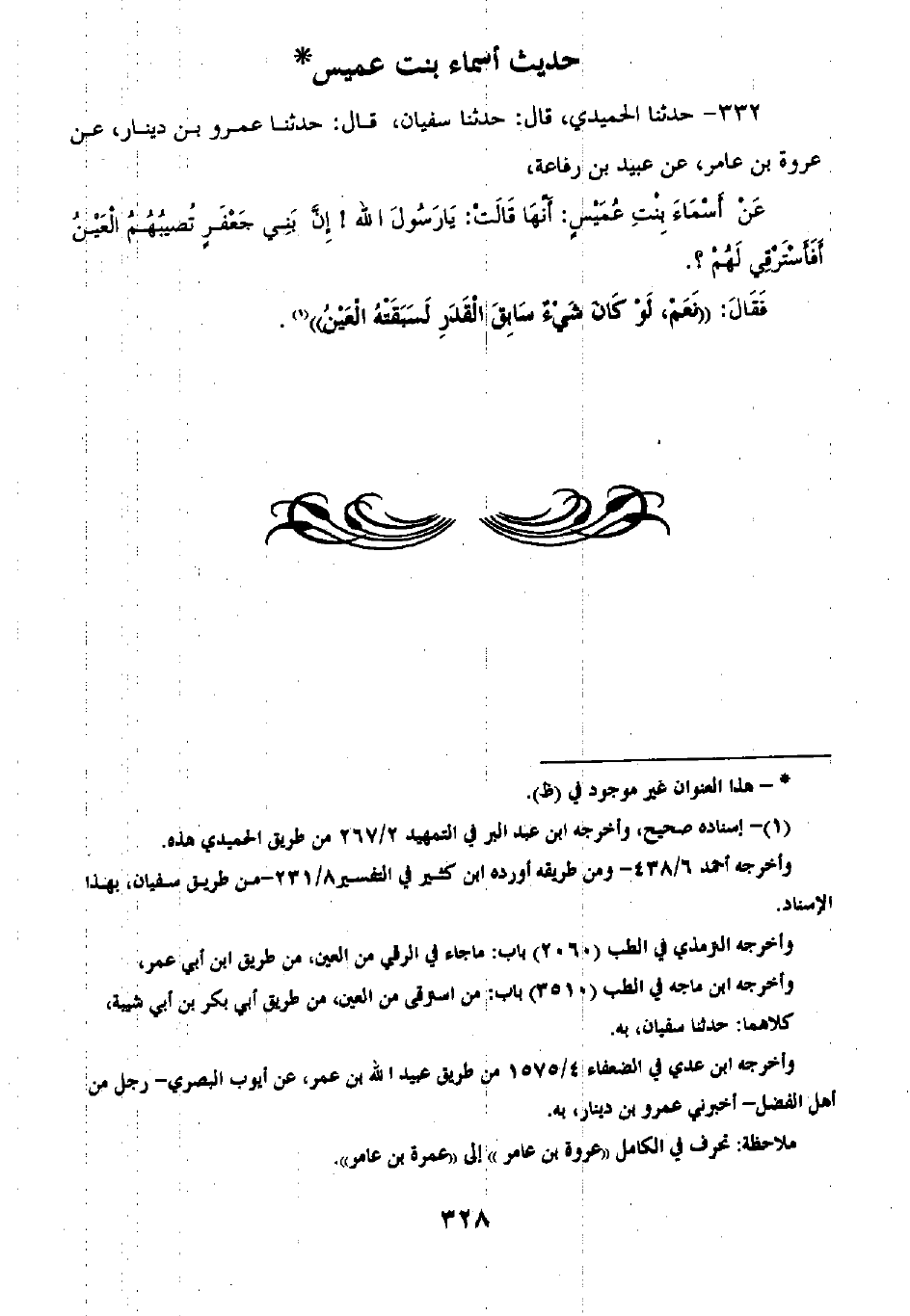 332 - حَدَّثَنَا الْحُمَيْدِيُّ قَالَ: ثنا سُفْيَانُ قَالَ: ثنا عَمْرُو بْنُ دِينَارٍ، عَنْ عُرْوَةَ بْنِ عَامِرٍ، عَنْ عُبَيْدِ بْنِ رِفَاعَةَ، عَنْ أَسْمَاءَ بِنْتِ عُمَيْسٍ أَنَّهَا قَالَتْ: يَا رَسُولَ اللَّهِ إِنَّ بَنِي جَعْفَرٍ تُصِيبُهُمُ الْعَيْنُ أَفَأَسْتَرْقِي لَهُمْ؟ فَقَالَ: «§نَعَمْ، لَوْ كَانَ شَيْءٌ سَابِقُ الْقَدَرِ لَسَبَقَتْهُ الْعَيْنُ»