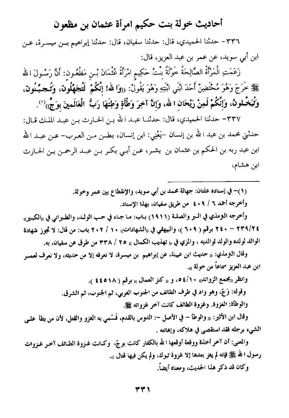 336 - حَدَّثَنَا الْحُمَيْدِيُّ قَالَ: ثنا سُفْيَانُ قَالَ: ثنا إِبْرَاهِيمُ بْنُ مَيْسَرَةَ، عَنِ ابْنِ أَبِي سُوَيْدٍ، عَنْ عُمَرَ بْنِ عَبْدِ الْعَزِيزِ قَالَ: زَعَمَتِ الْمَرْأَةُ الصَّالِحَةُ خَوْلَةُ بِنْتُ حَكِيمٍ امْرَأَةُ عُثْمَانَ بْنِ مَظْعُونٍ أَنَّ رَسُولَ اللَّهِ صَلَّى اللهُ عَلَيْهِ وَسَلَّمَ خَرَجَ وَهُوَ مُحْتَضِنٌ أَحَدَ بَنِي ابْنَتِهِ وَهُوَ يَقُولُ «وَاللَّهِ §إِنَّكُمْ لَتُجَهِّلُونَ، وَتُجَبِّنُونَ، وَتُبَخِّلُونَ، وَإِنَّكُمْ لَمِنْ رَيْحَانِ اللَّهِ وَإِنَّ آخِرَ وَطْأَةٍ وَطِئَهَا رَبُّ الْعَالَمِينَ بِوَجٍّ»