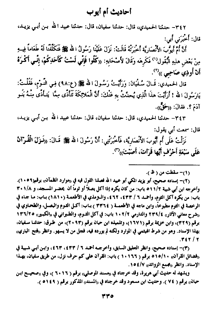 343 - حَدَّثَنَا الْحُمَيْدِيُّ قَالَ: ثنا سُفْيَانُ قَالَ: ثنا عُبَيْدُ اللَّهِ بْنُ أَبِي يَزِيدَ قَالَ: سَمِعْتُ أَبِي يَقُولُ: نَزَلْتُ عَلَى أُمِّ أَيُّوبَ الْأَنْصَارِيَّةِ فَأَخْبَرَتْنِي أَنَّ رَسُولَ اللَّهِ صَلَّى اللهُ عَلَيْهِ وَسَلَّمَ قَالَ: «§نَزَلَ الْقُرْآنُ عَلَى سَبْعَةِ أَحْرُفٍ أَيَّهَا قَرَأْتَ أَصَبْتَ»
